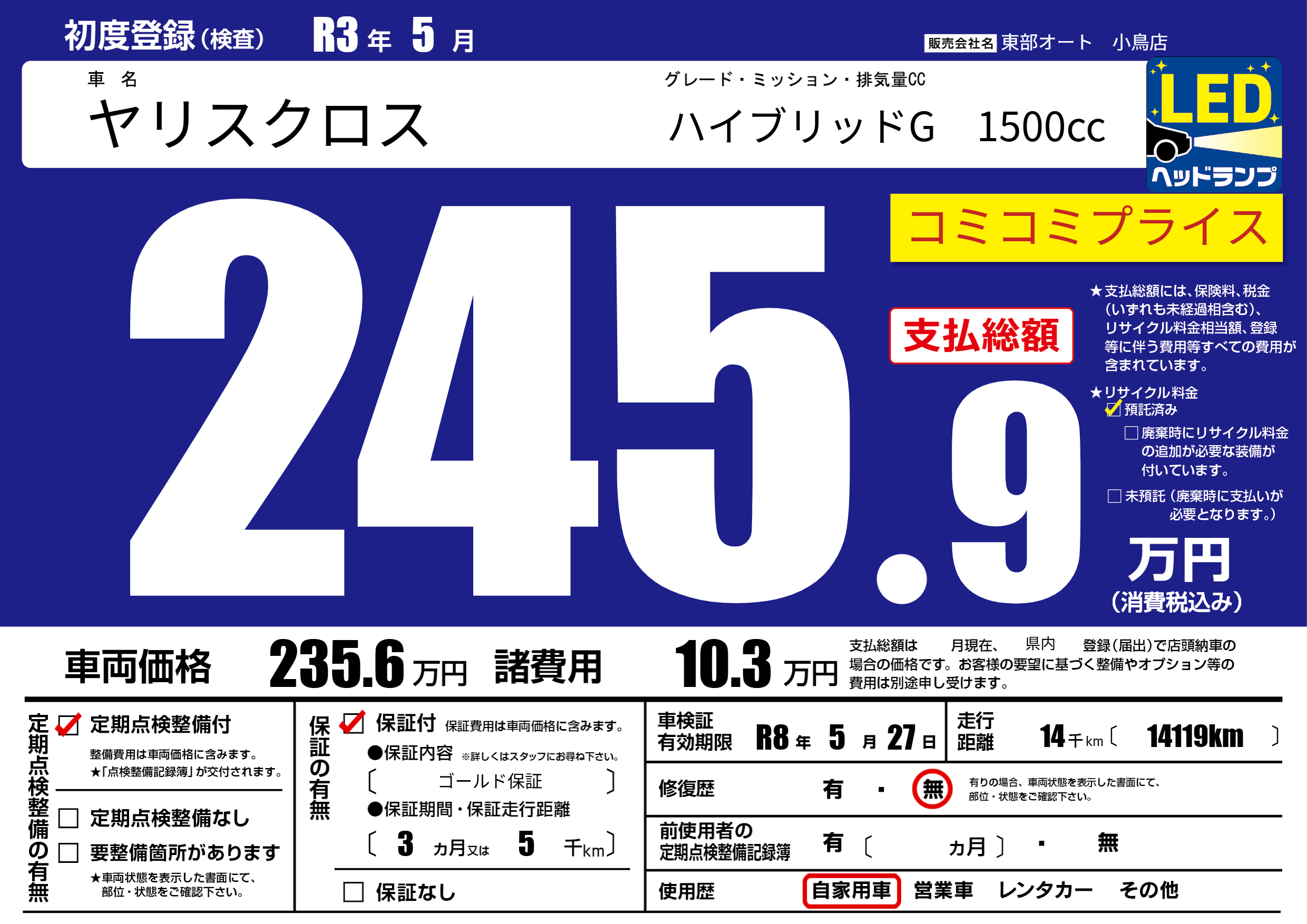 | 車名 | ヤリスクロス | グレード ミッション 排気量 |