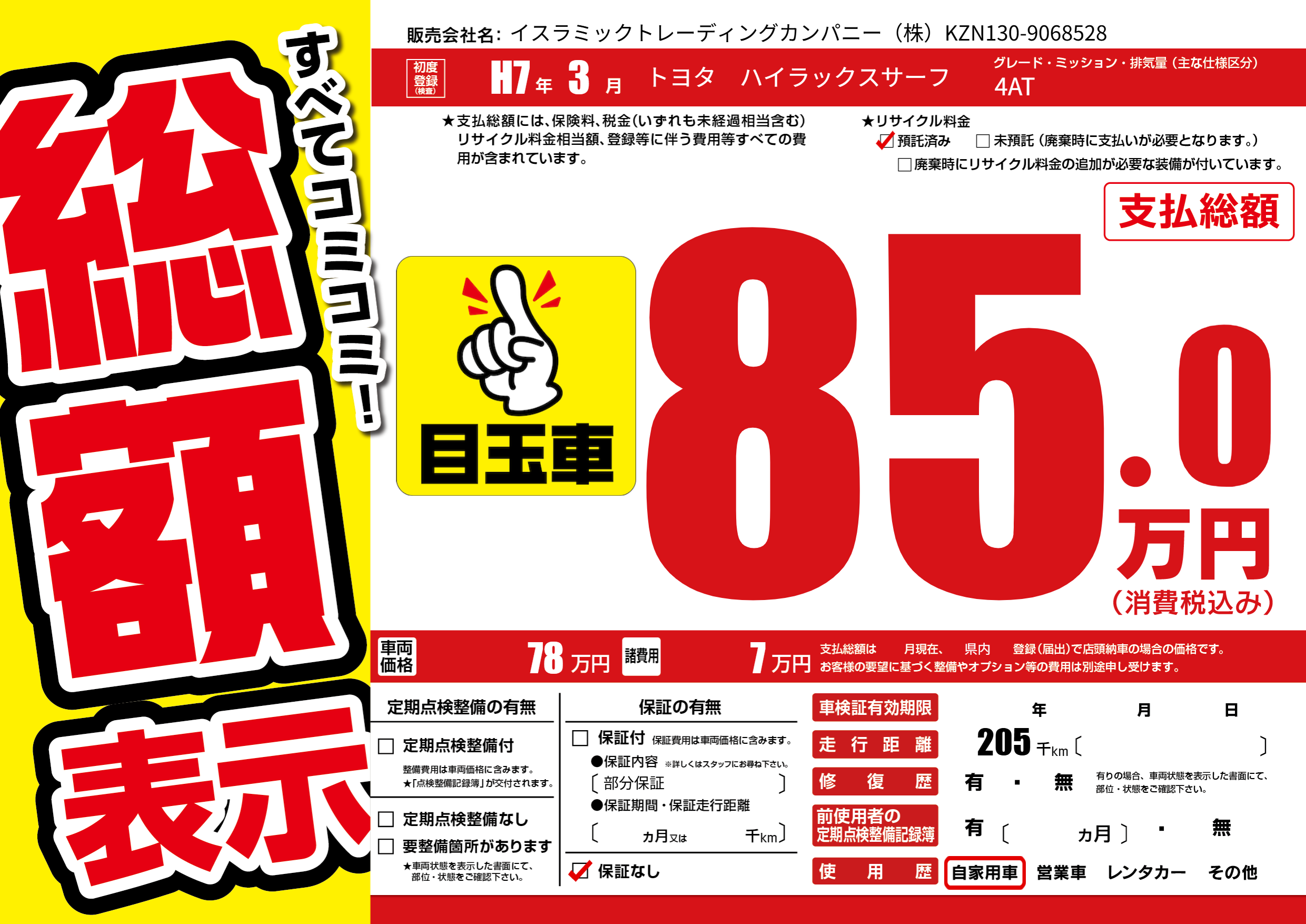 | 車名 | トヨタ ハイラックスサーフ | グレード ミッション 排気量 |