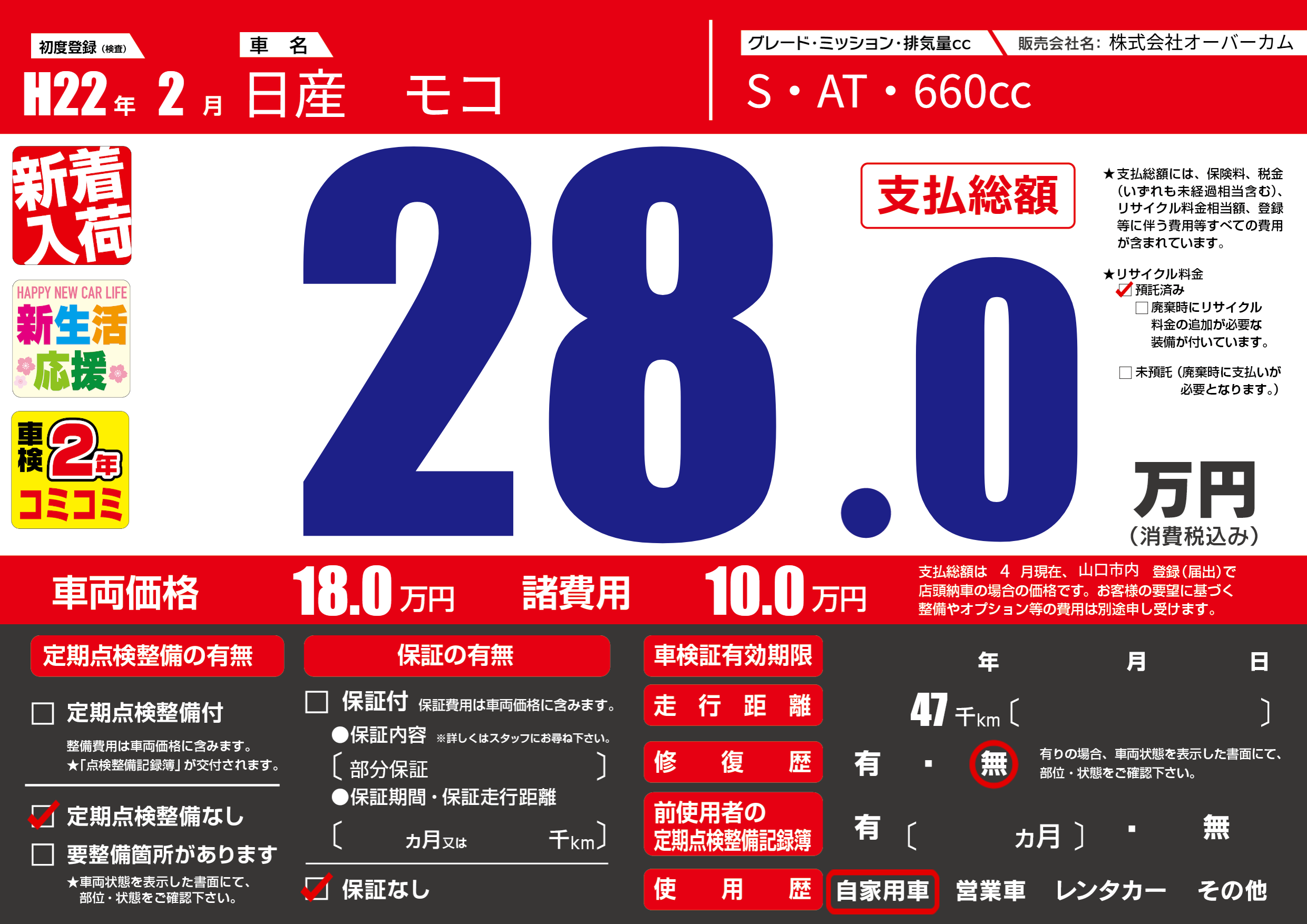 | 走行キロ | 4.7万km | 初年度登録 | H22年2月 |
