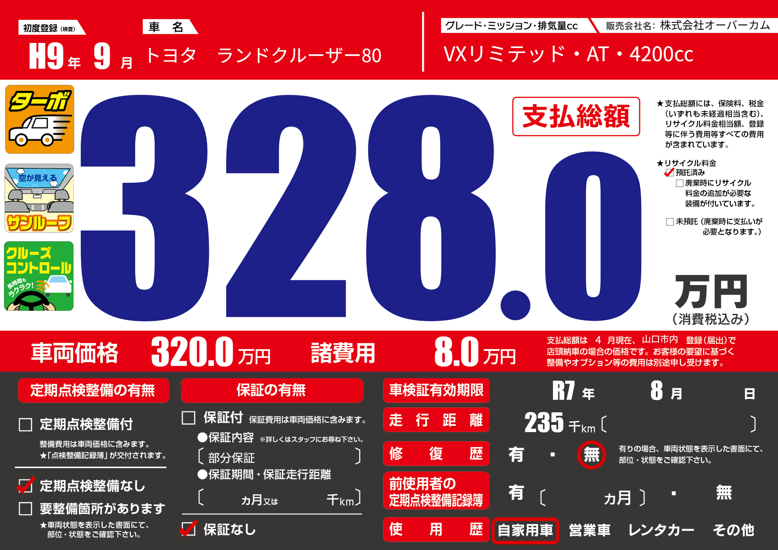 | 車名 | トヨタ ランドクルーザー80 | グレード ミッション 排気量 |