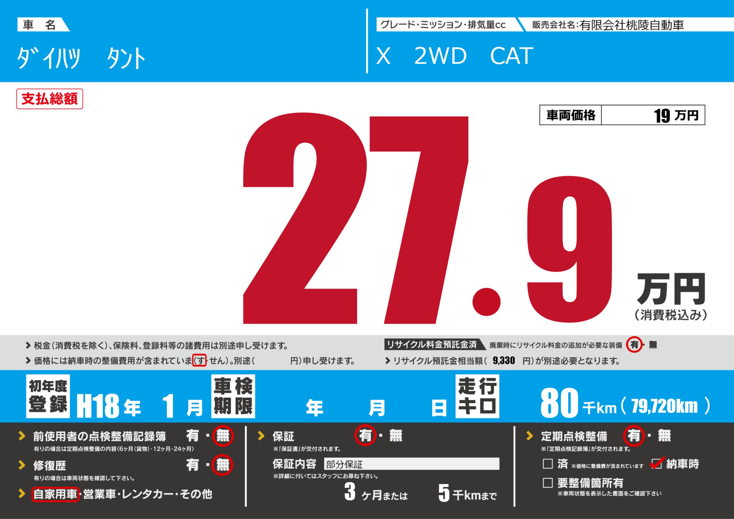 | 定期点検整備 | 定期点検整備あり 納車時あり | ||