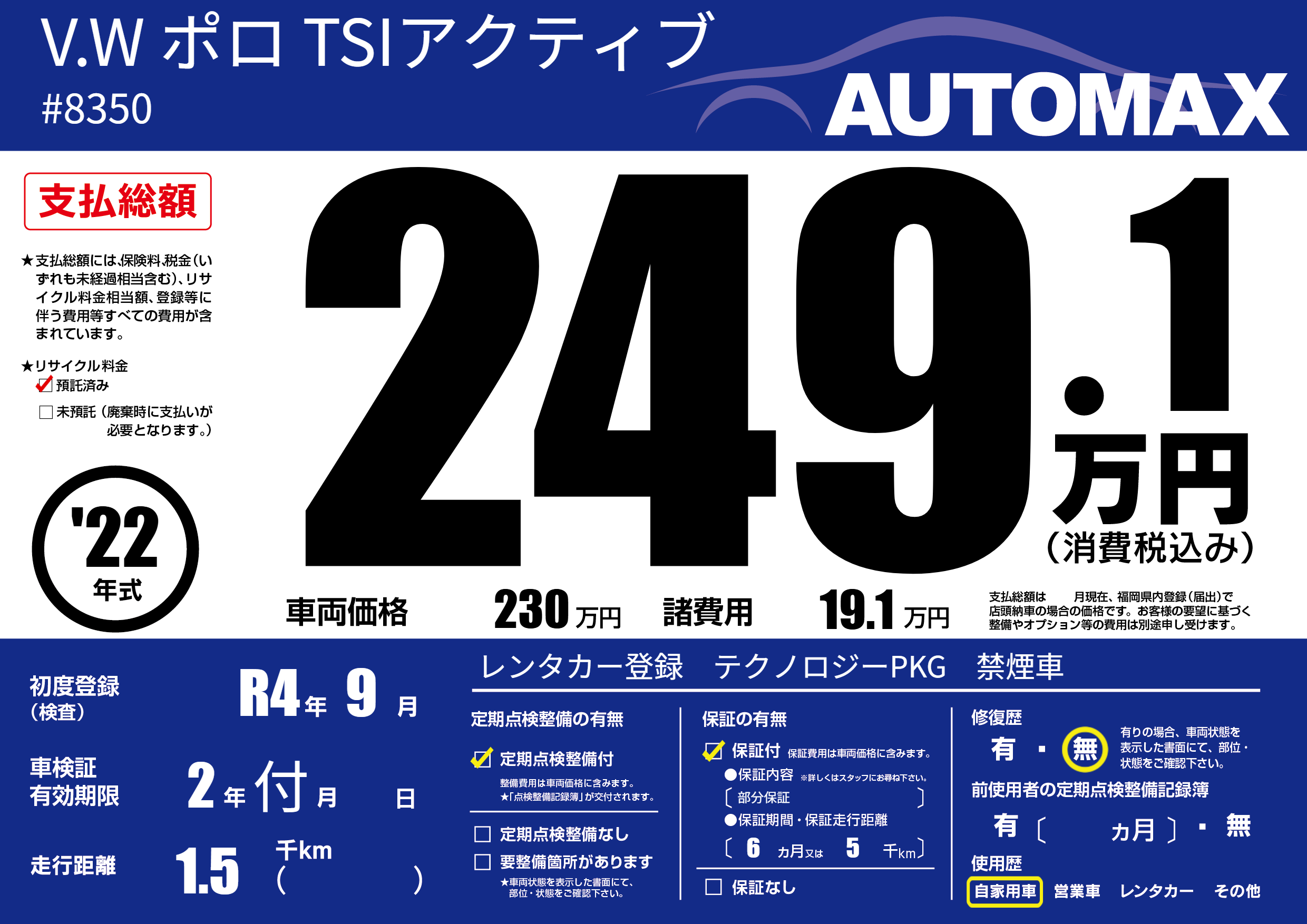 | 走行キロ | 0.1万km | 初年度登録 | R4年9月 |
