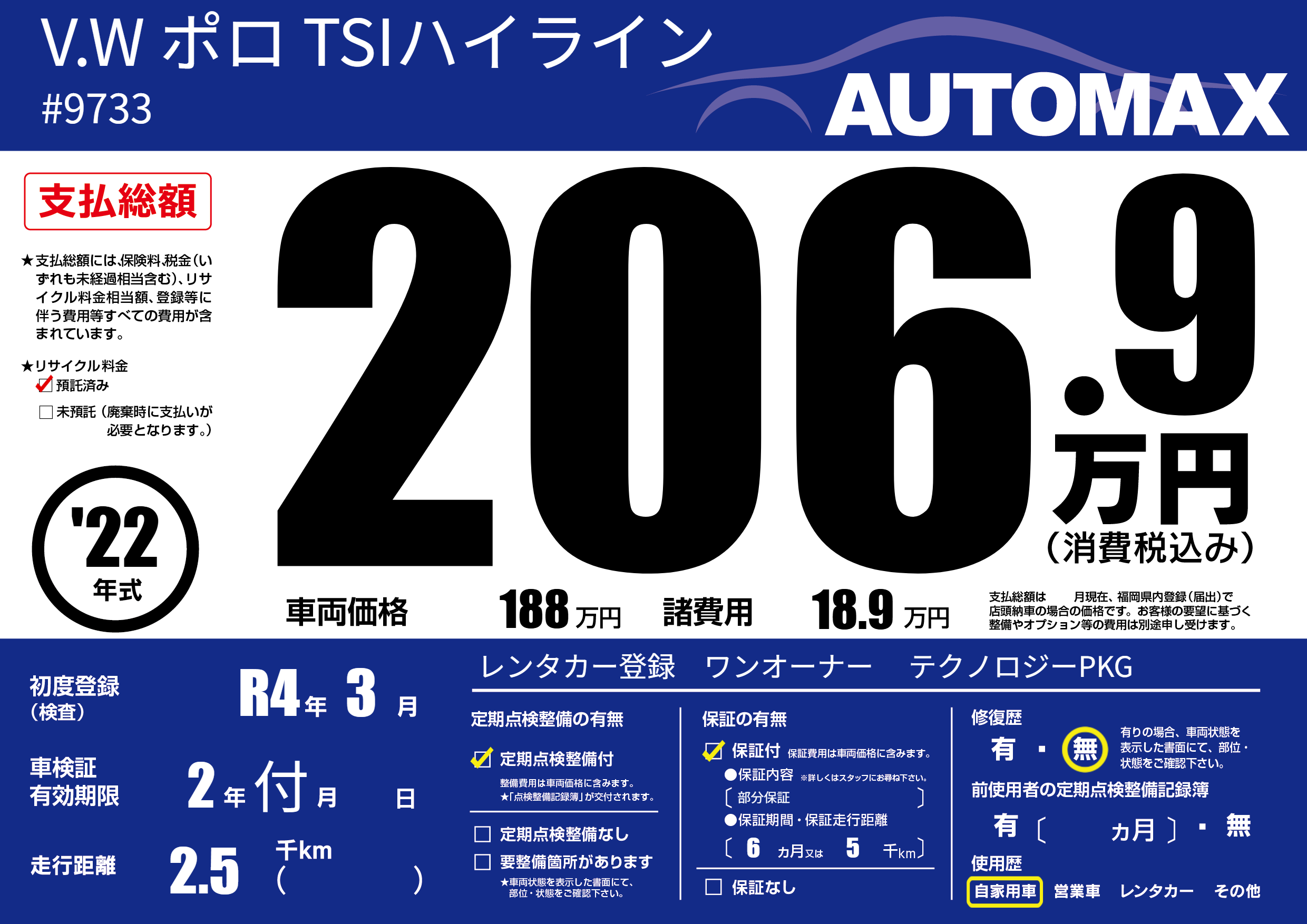 | 車名 | V.W ポロ TSIハイライン | グレード ミッション 排気量 |