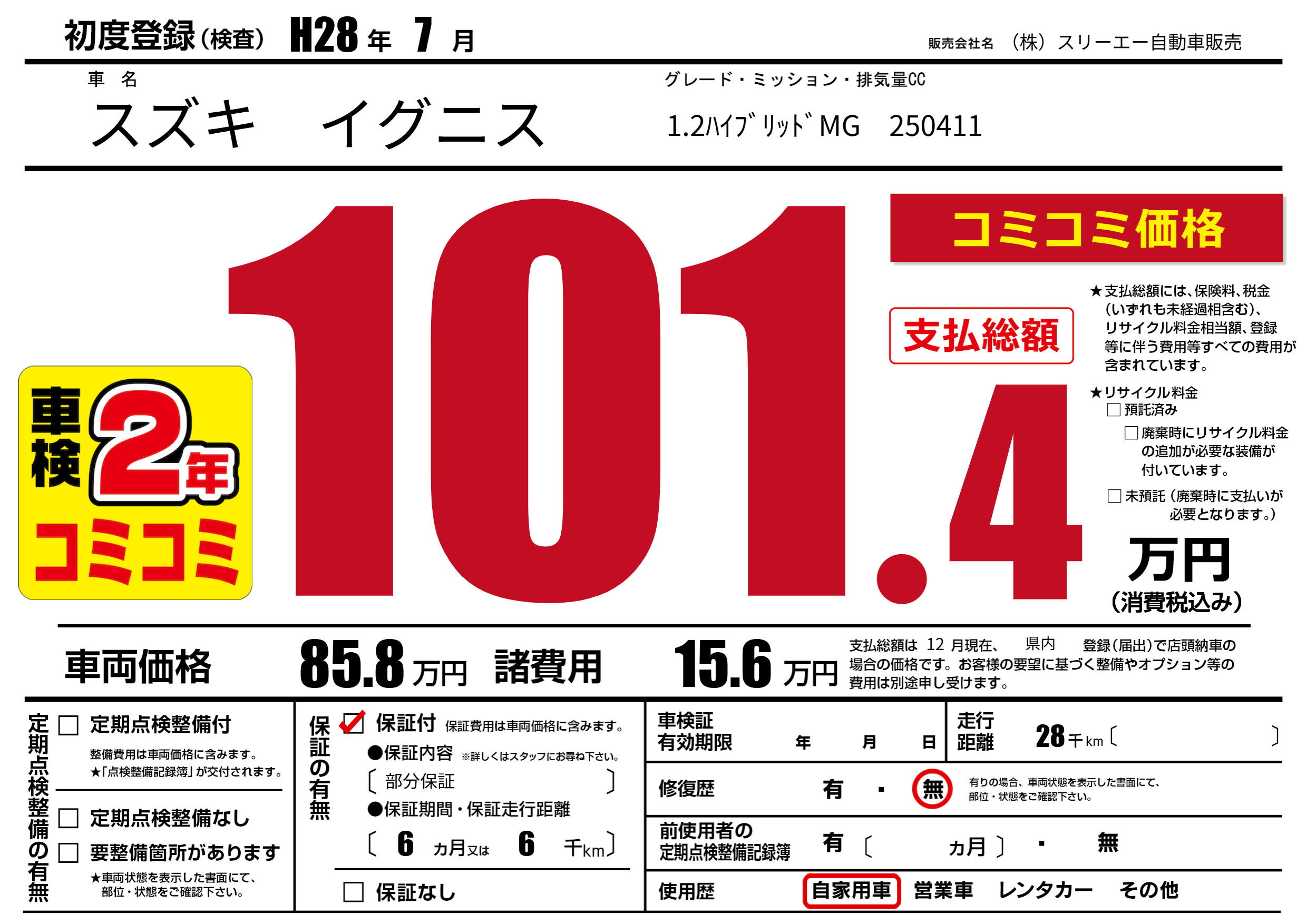 | 走行キロ | 2.8万km | 初年度登録 | H28年7月 |