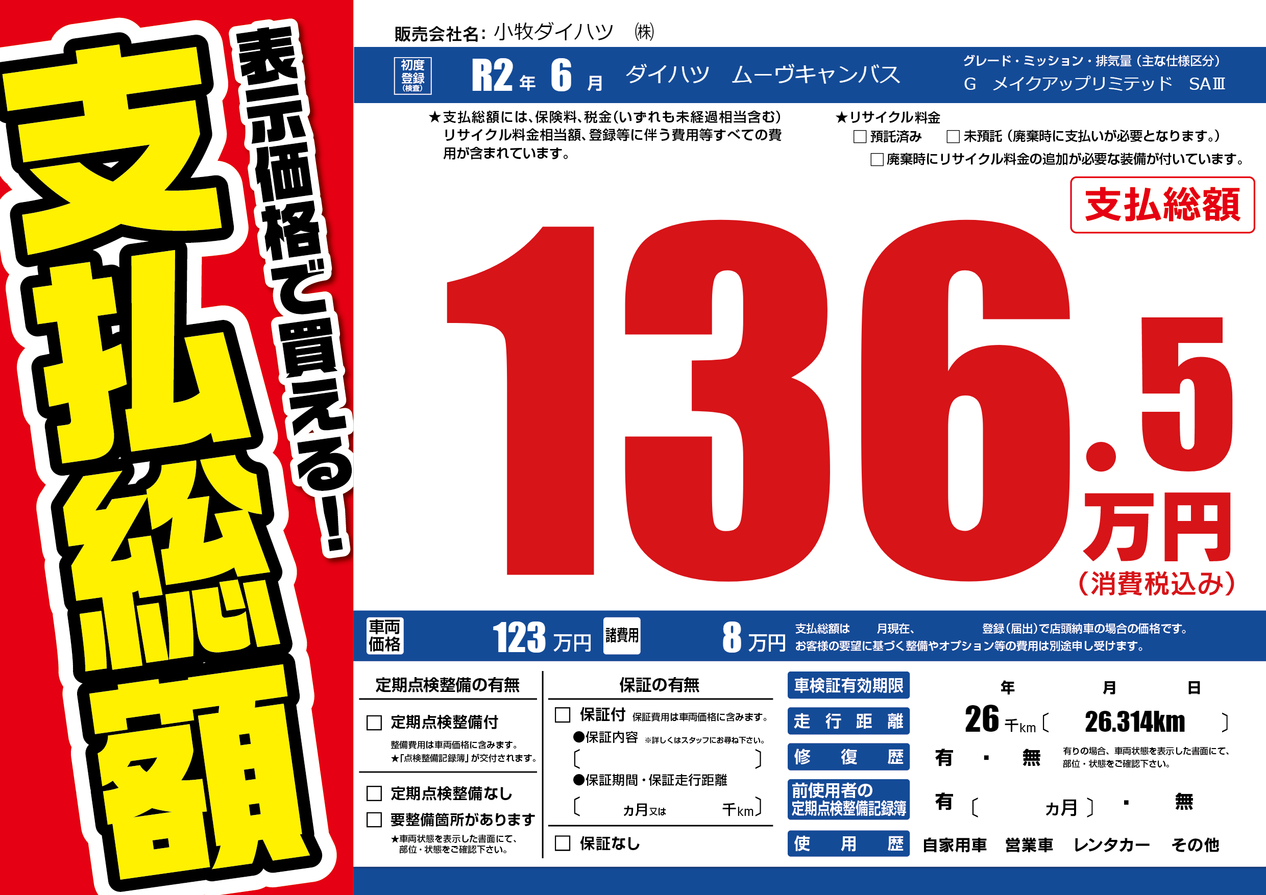 | 走行キロ | 2.6万km | 初年度登録 | R2年6月 |