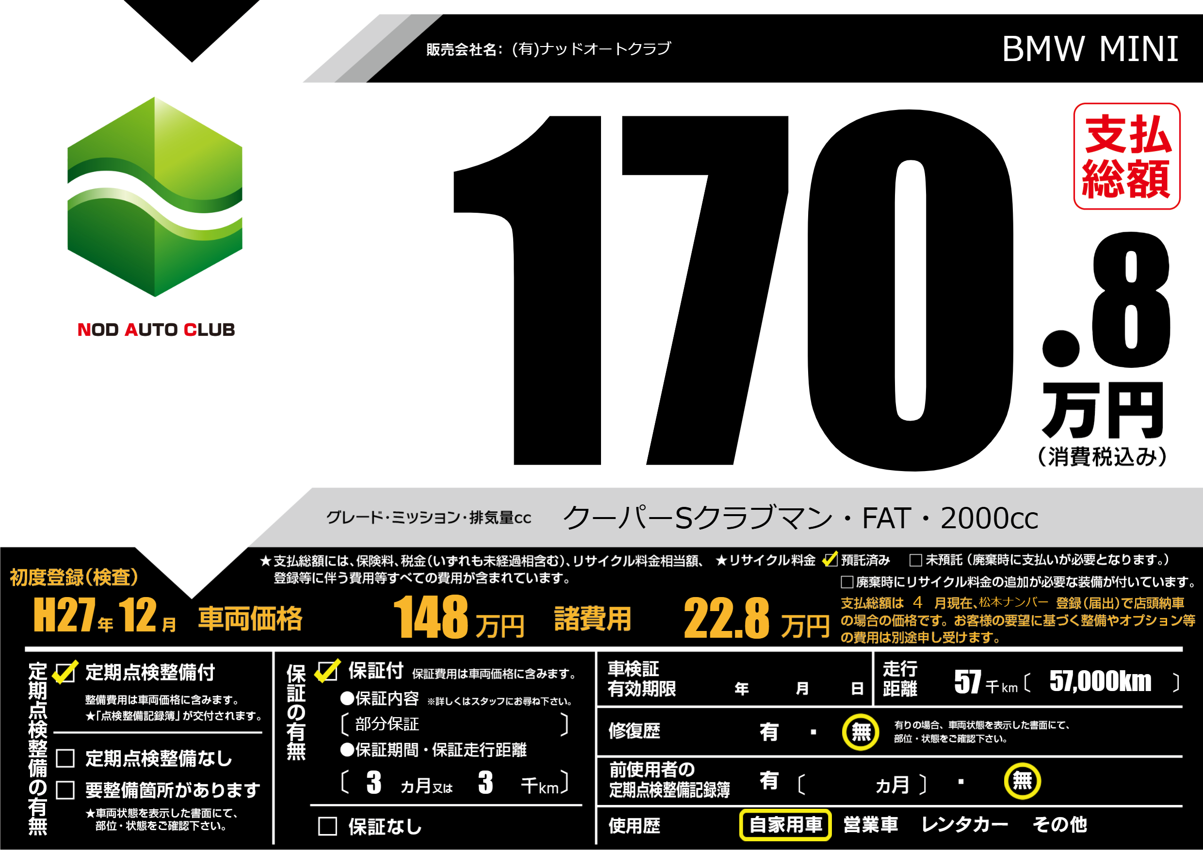 | 車名 | BMW MINI | グレード ミッション 排気量 |