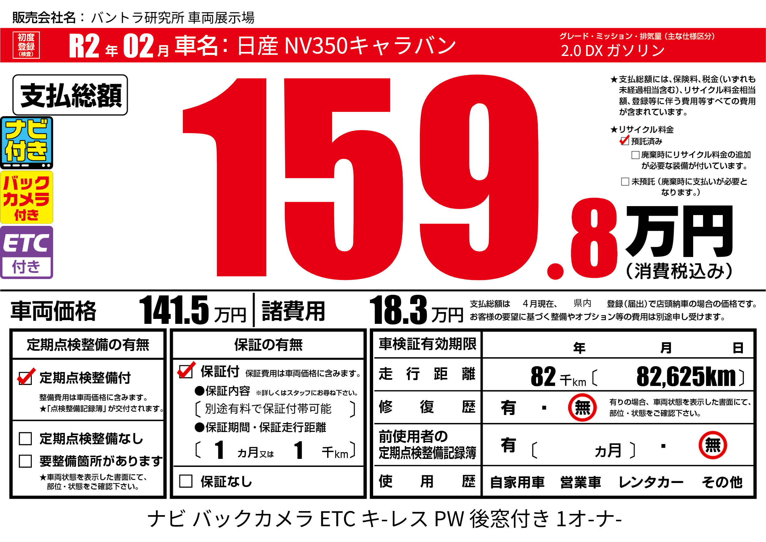 | 走行キロ | 8.2万km | 初年度登録 | R2年02月 |