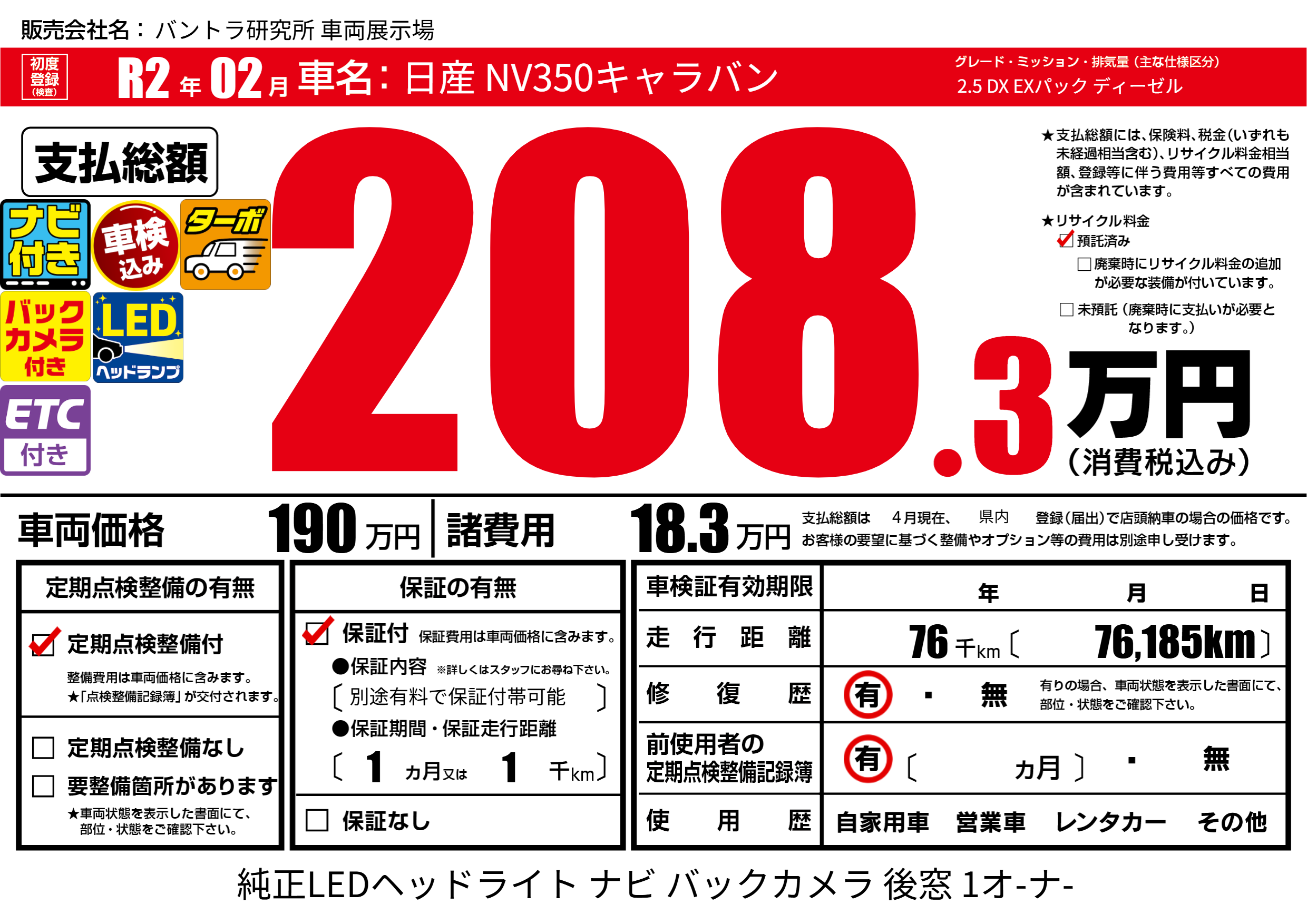 | 走行キロ | 7.6万km | 初年度登録 | R2年02月 |