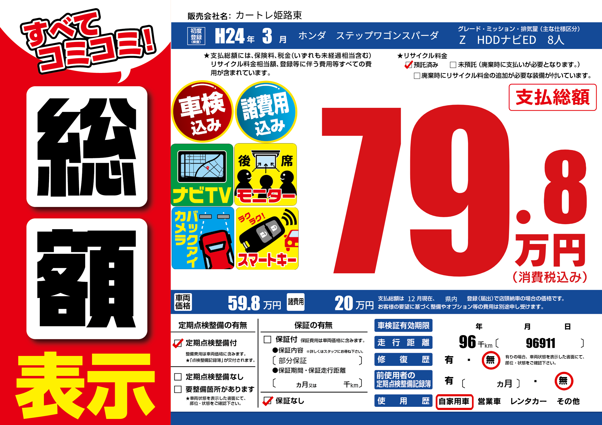 | 走行キロ | 9.6万km | 初年度登録 | H24年3月 |