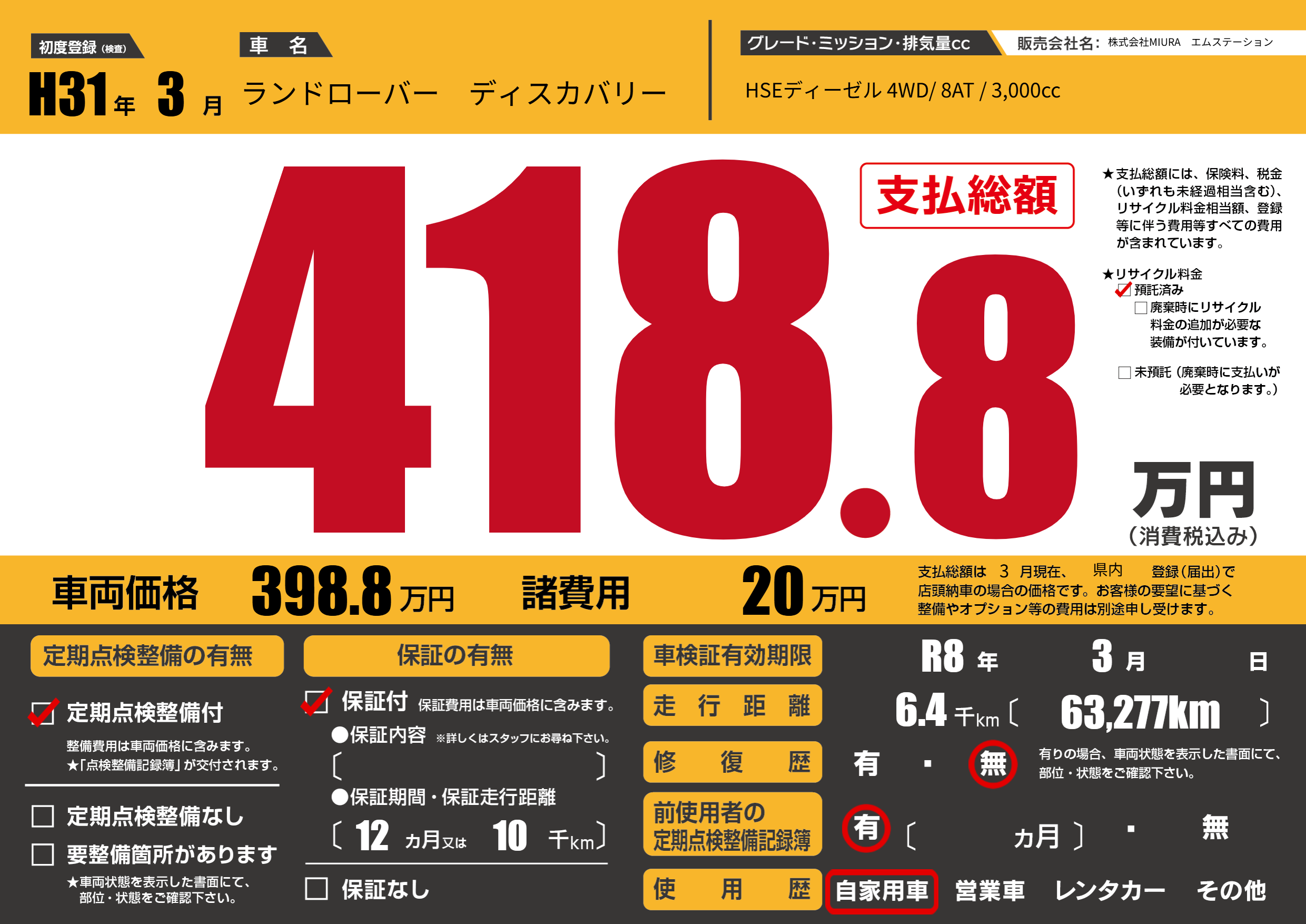 | 車名 | ランドローバー ディスカバリー | グレード ミッション 排気量 |
