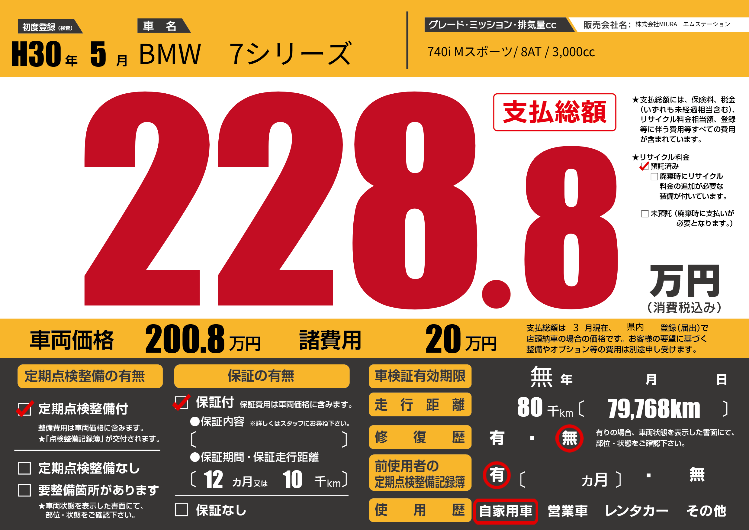 | 車名 | BMW 7シリーズ | グレード ミッション 排気量 |
