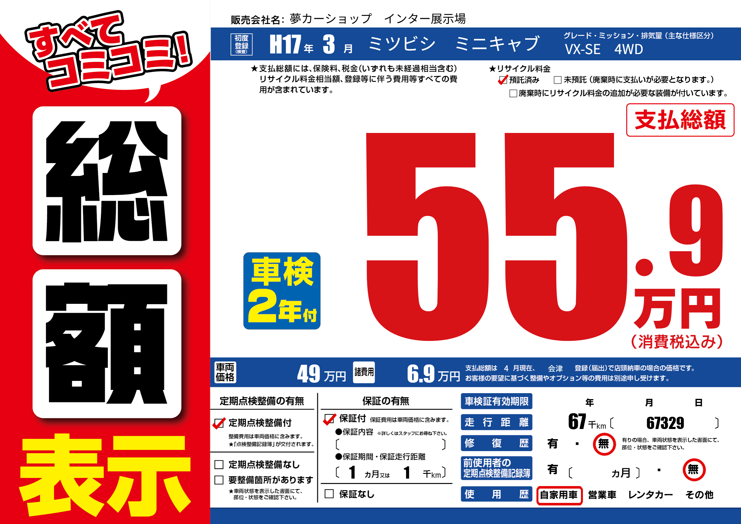 | 走行キロ | 6.7万km | 初年度登録 | H17年3月 |