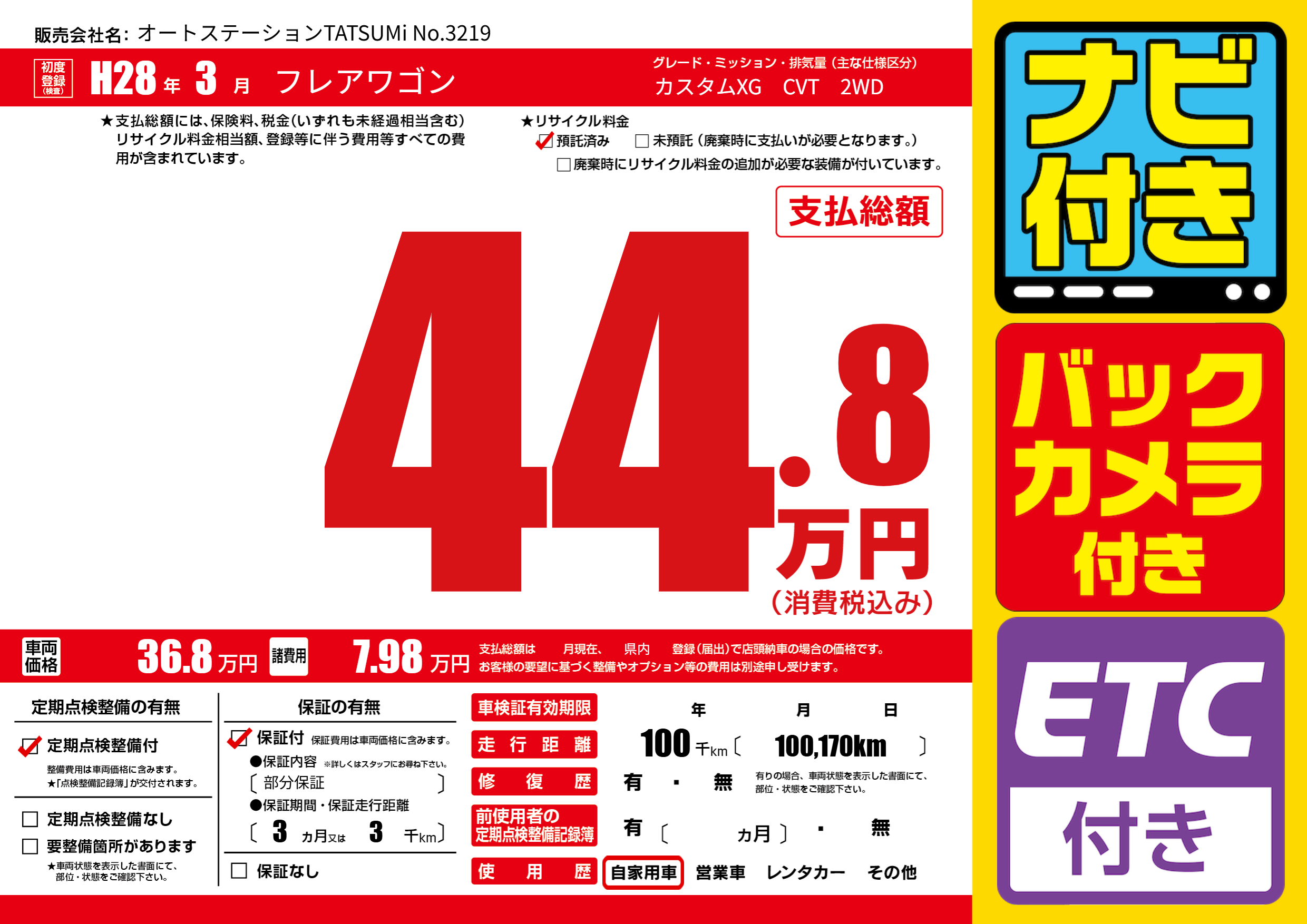 | 走行キロ | 10万km | 初年度登録 | H28年3月 |