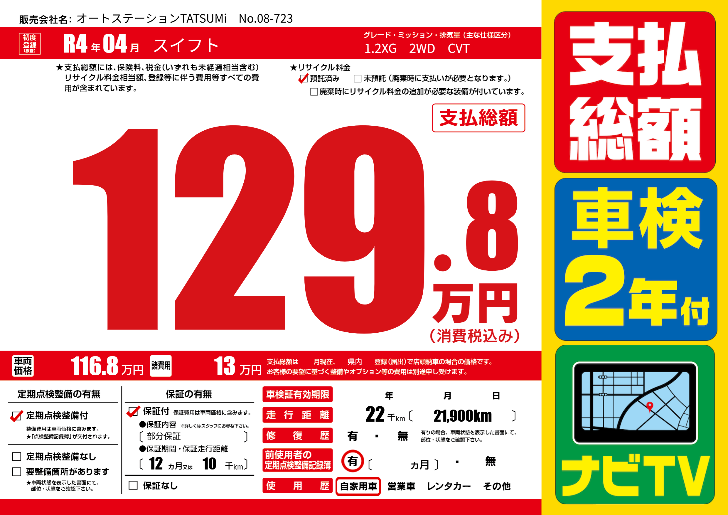 | 走行キロ | 2.2万km | 初年度登録 | R4年04月 |