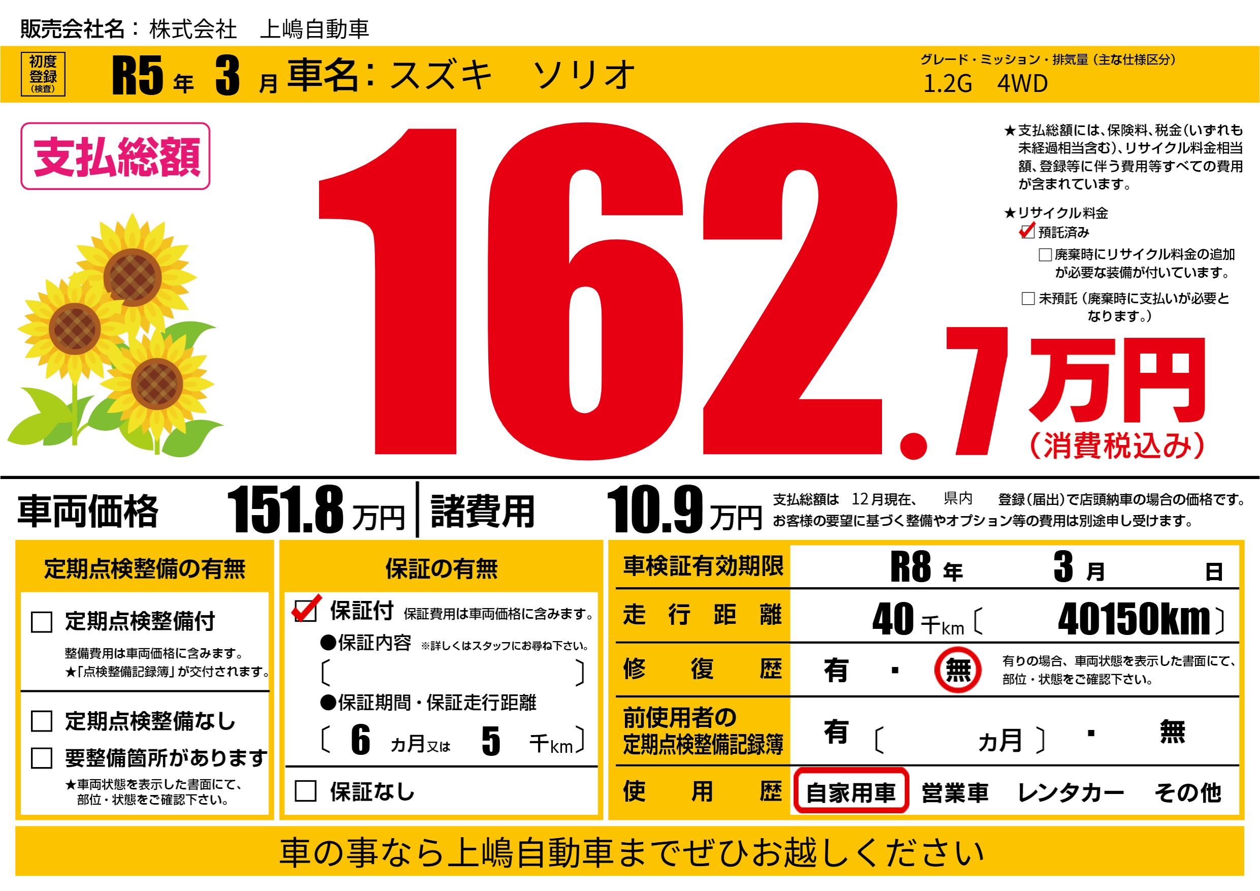| 車名 | スズキ ソリオ | グレード ミッション 排気量 |