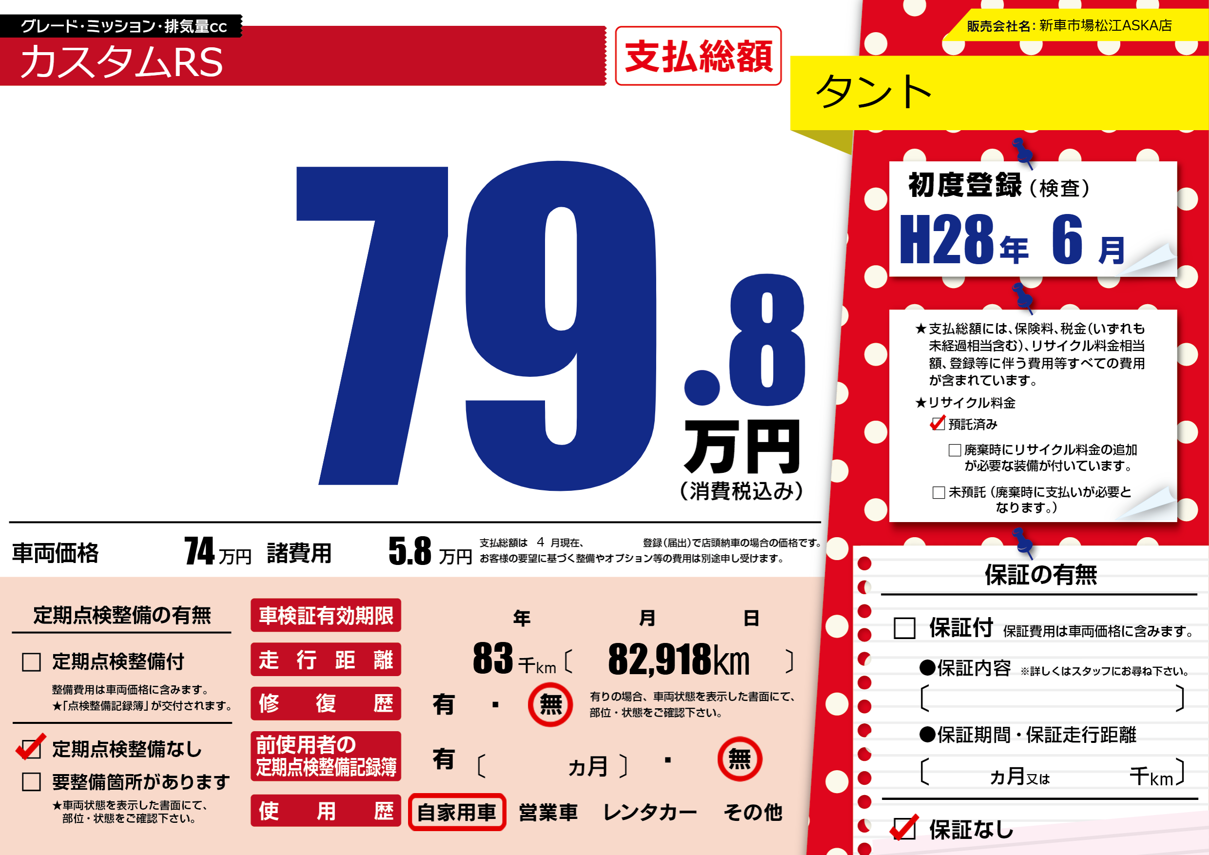 | 走行キロ | 8.3万km | 初年度登録 | H28年6月 |