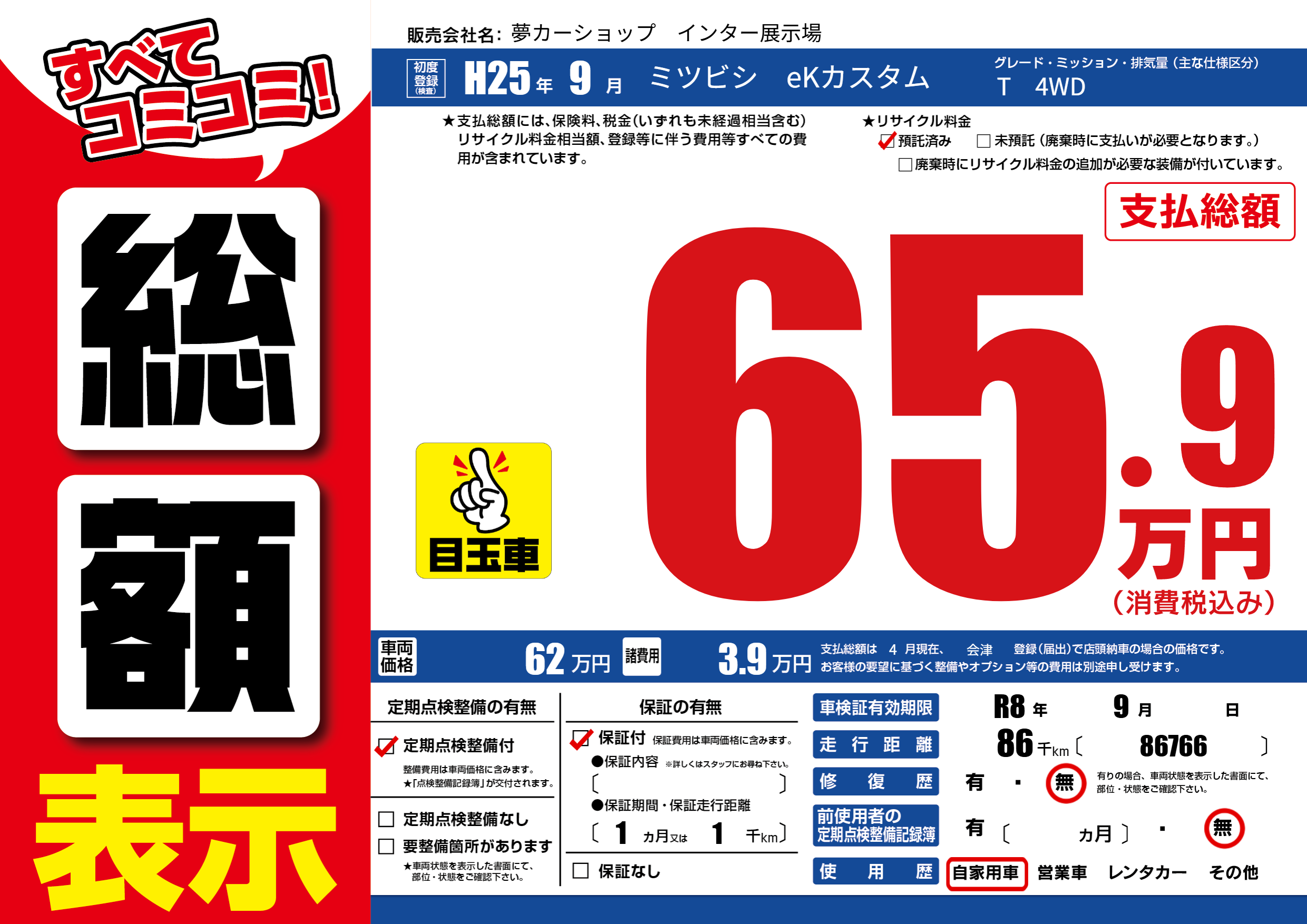 | 走行キロ | 8.6万km | 初年度登録 | H25年9月 |
