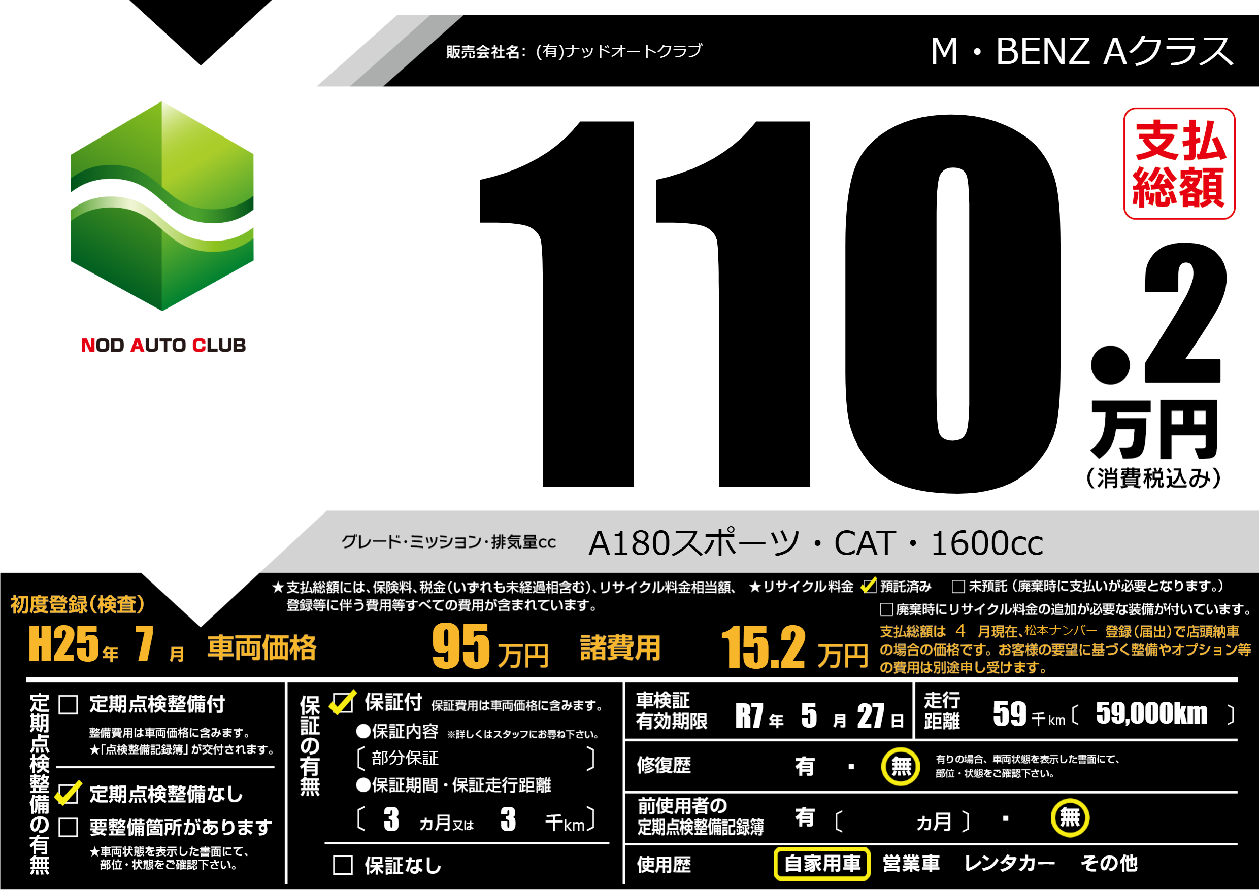 | 車名 | M・BENZ Aクラス | グレード ミッション 排気量 |