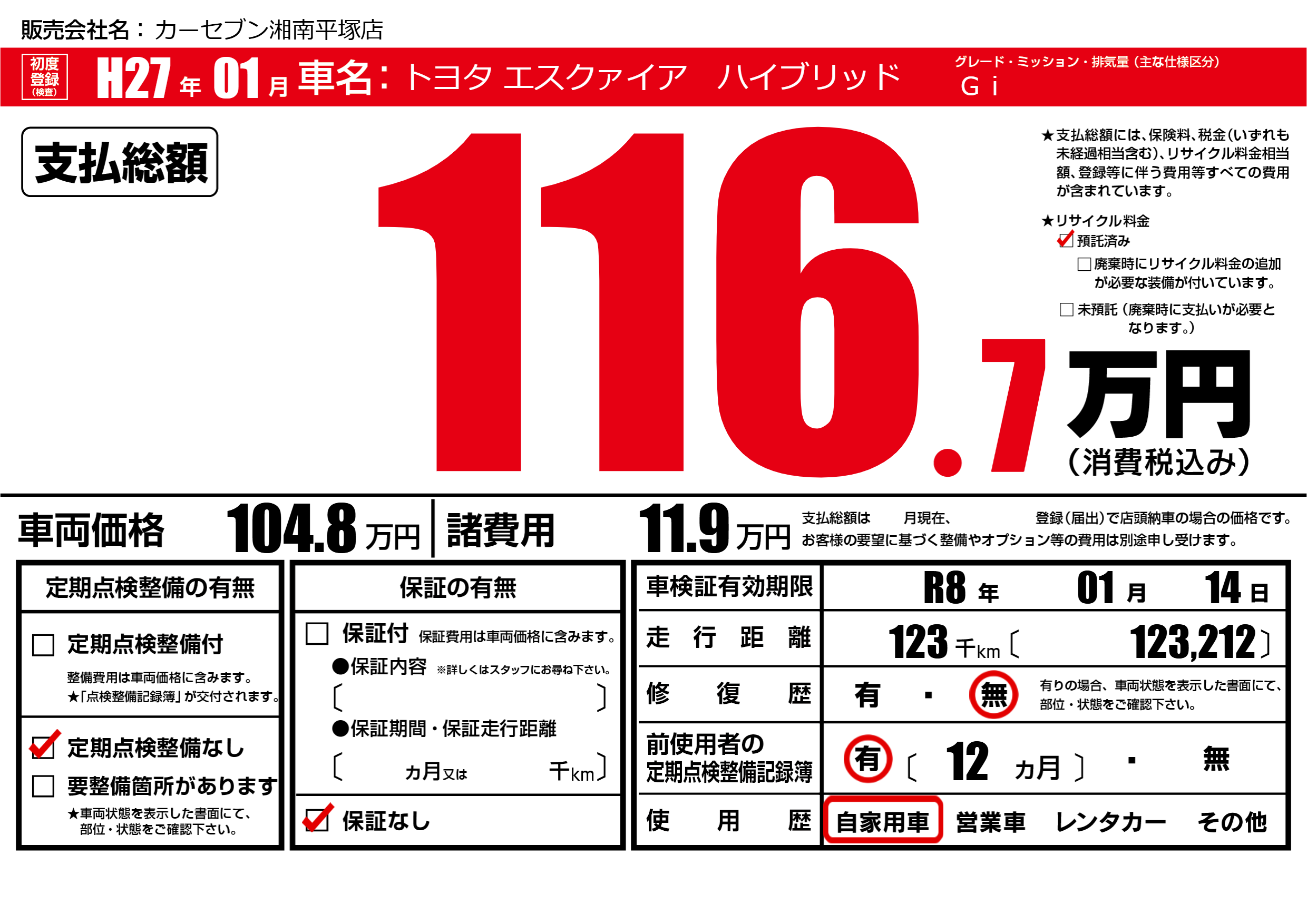 | 走行キロ | 12.3万km | 初年度登録 | H27年01月 |