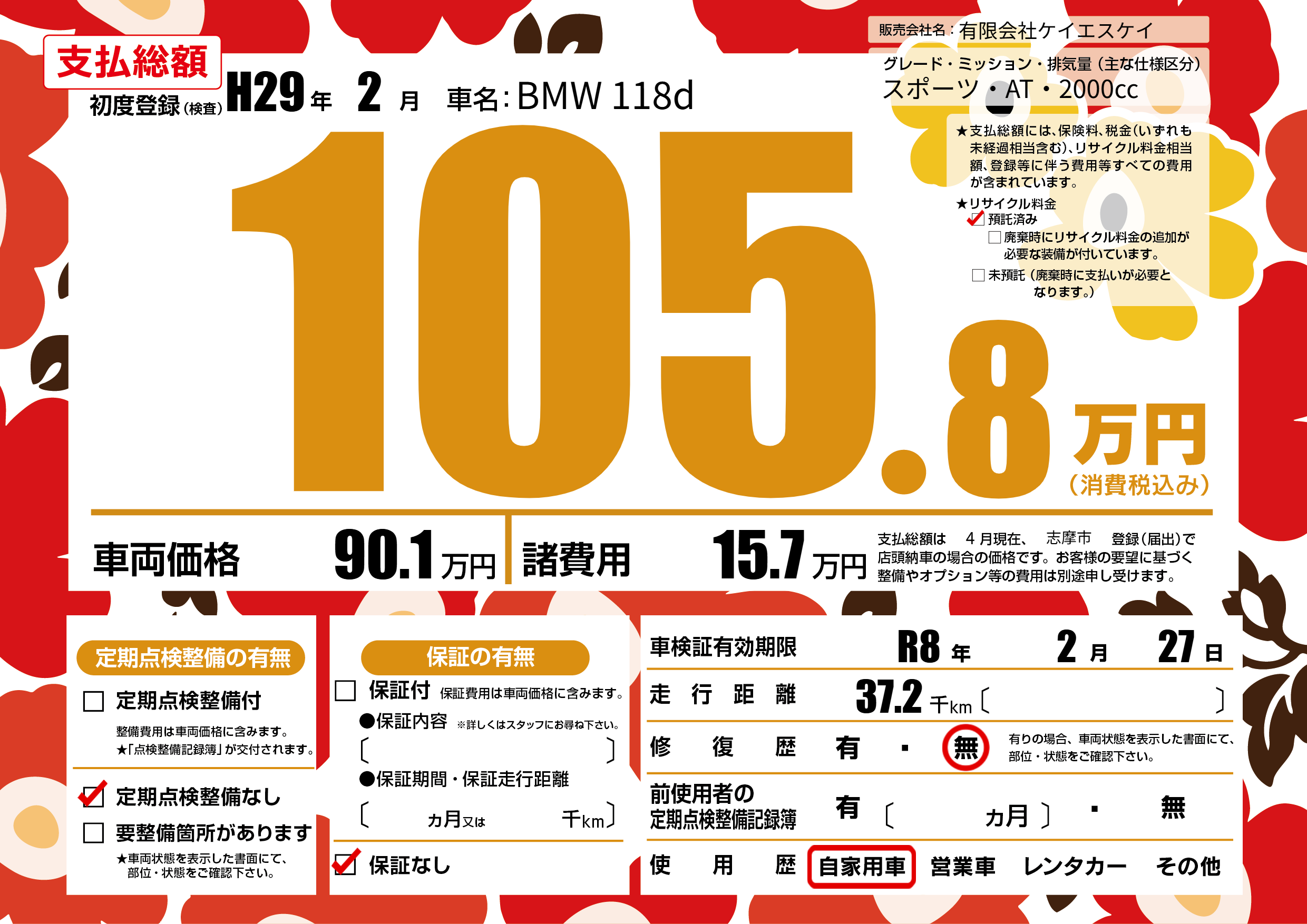| 車名 | BMW 118d | グレード ミッション 排気量 |