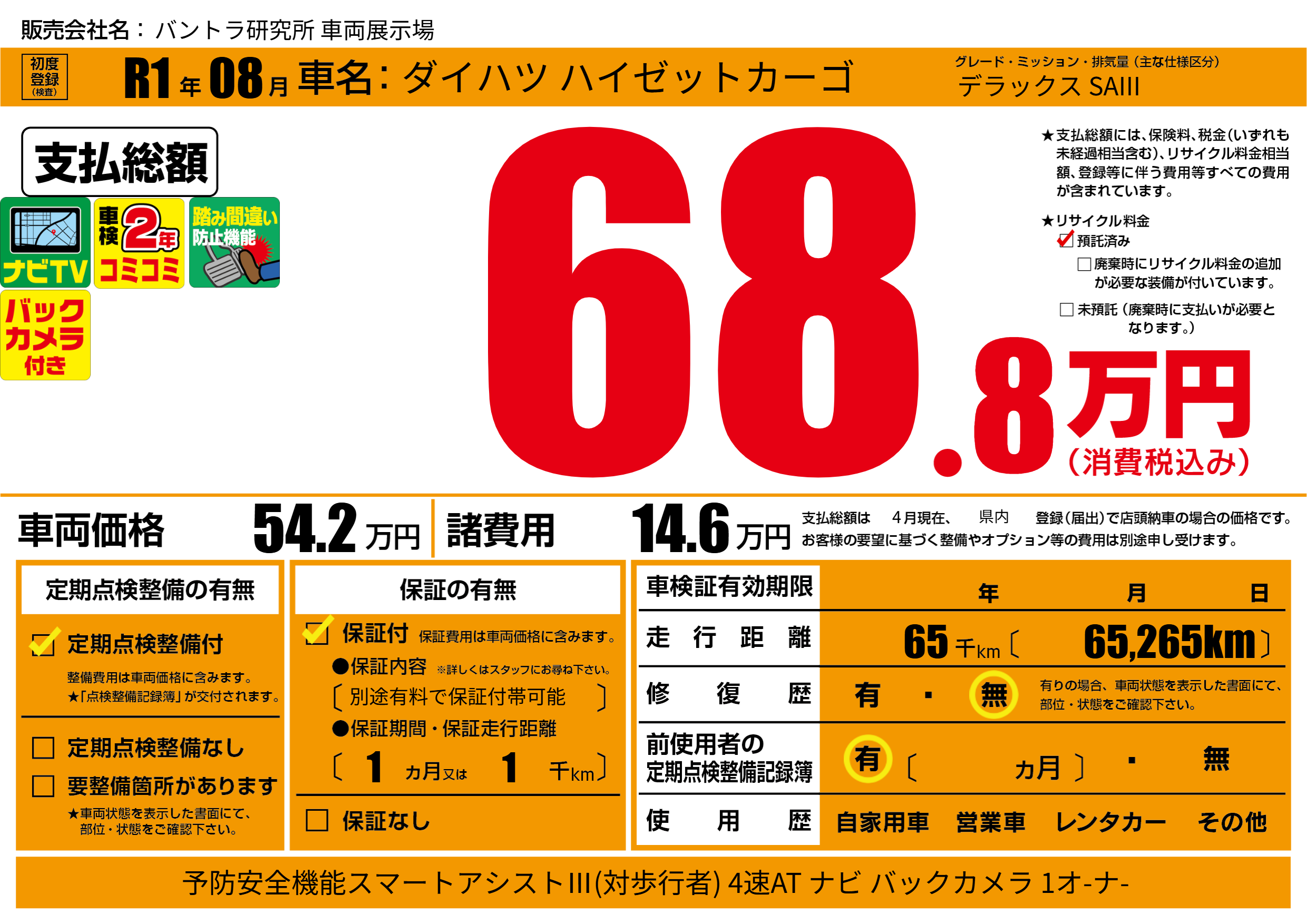| 走行キロ | 6.5万km | 初年度登録 | R1年08月 |