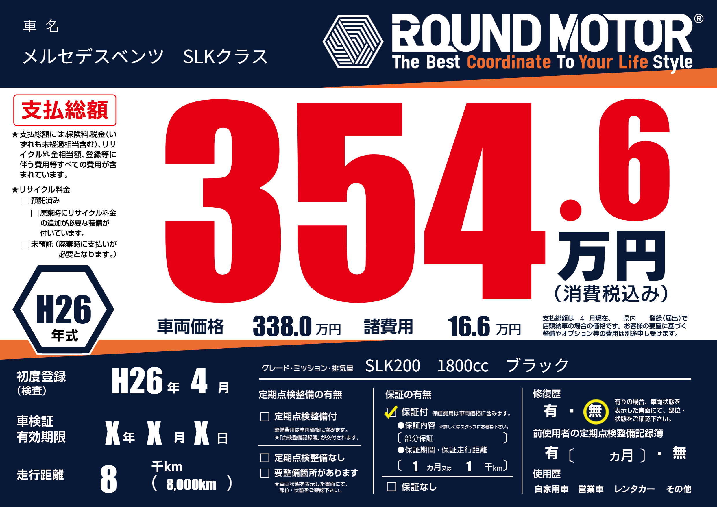 | 車名 | メルセデスベンツ SLKクラス | グレード ミッション 排気量 |