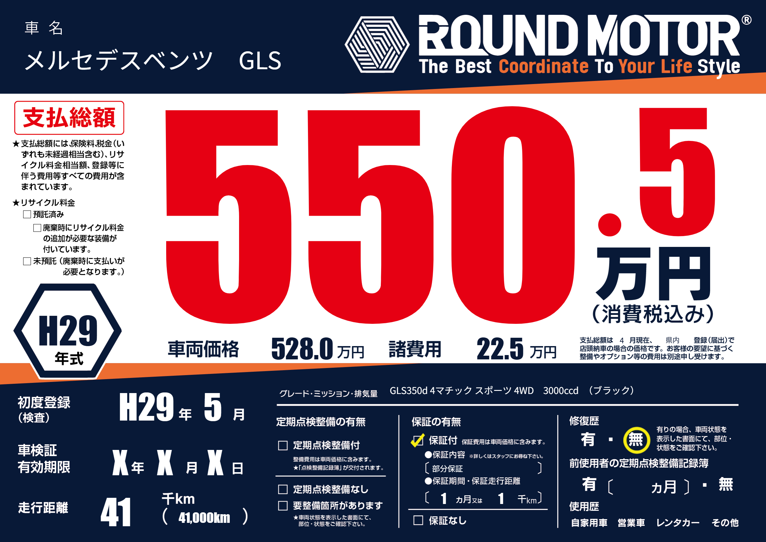 | 車名 | メルセデスベンツ GLS | グレード ミッション 排気量 |