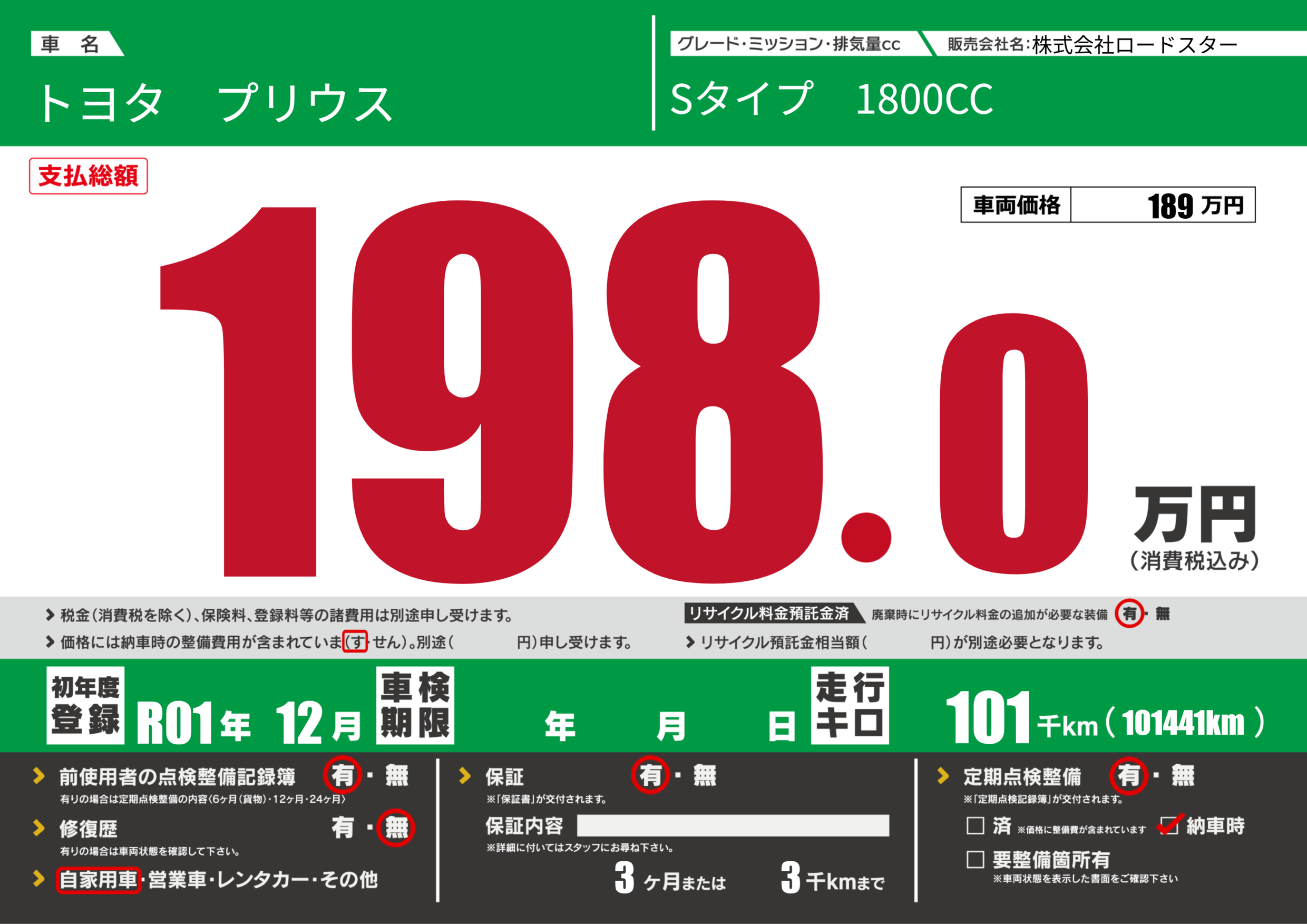 | 車名 | トヨタ プリウス | グレード ミッション 排気量 |