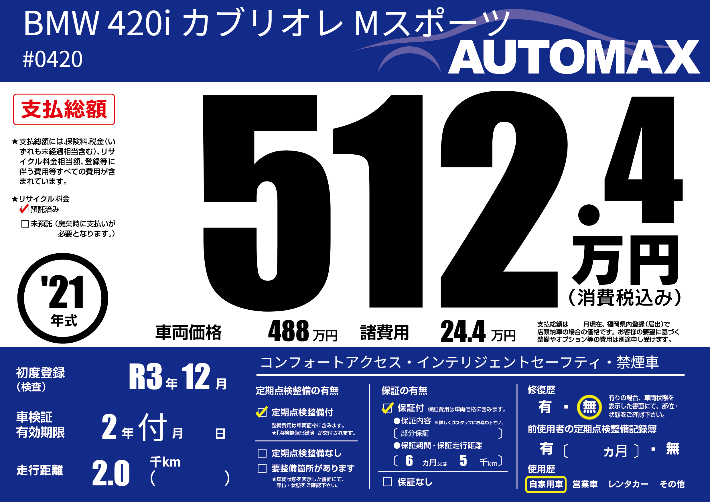 | 車名 | BMW 420i カブリオレ Mスポーツ | グレード ミッション 排気量 |