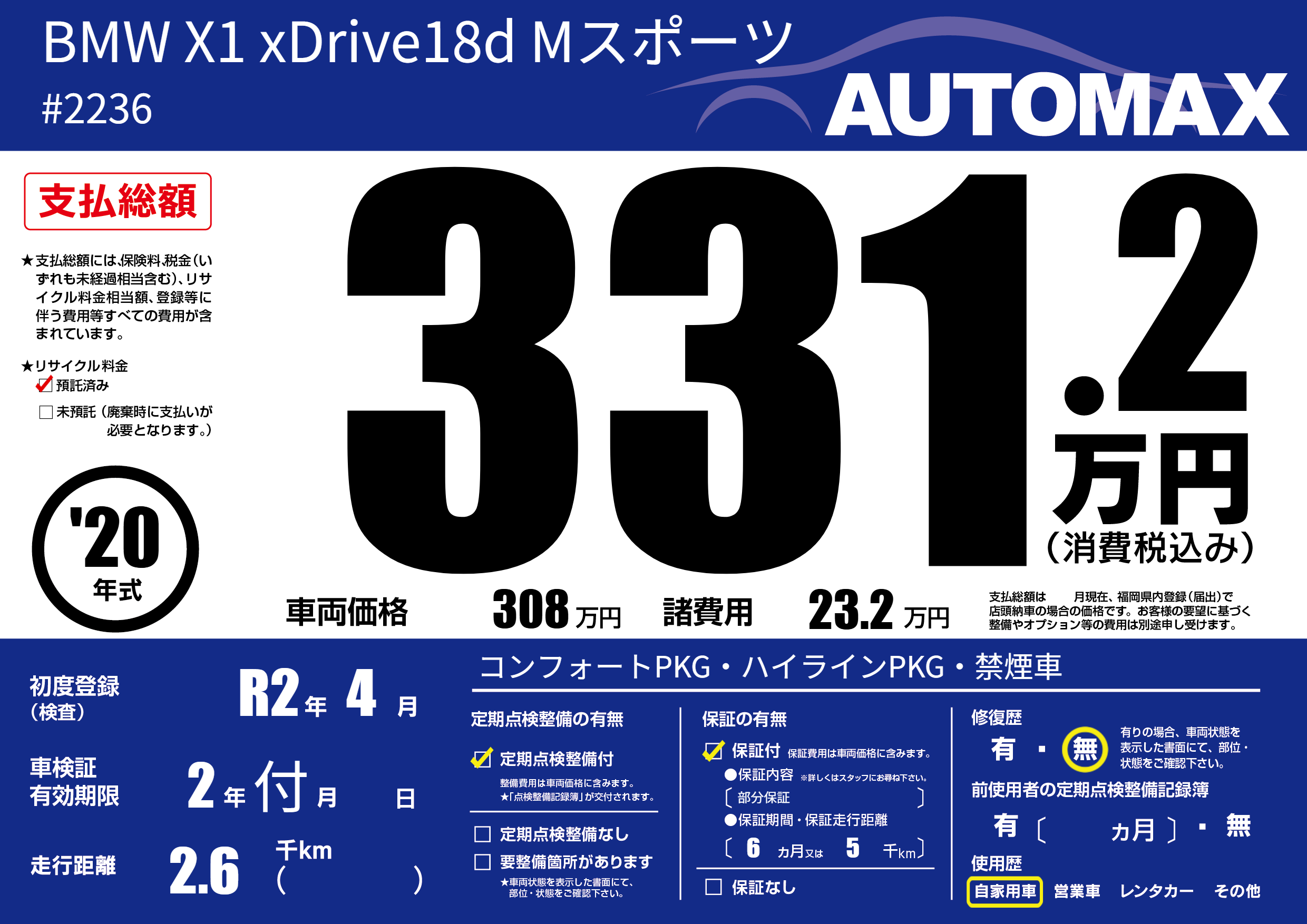 | 車名 | BMW X1 xDrive18d Mスポーツ | グレード ミッション 排気量 |