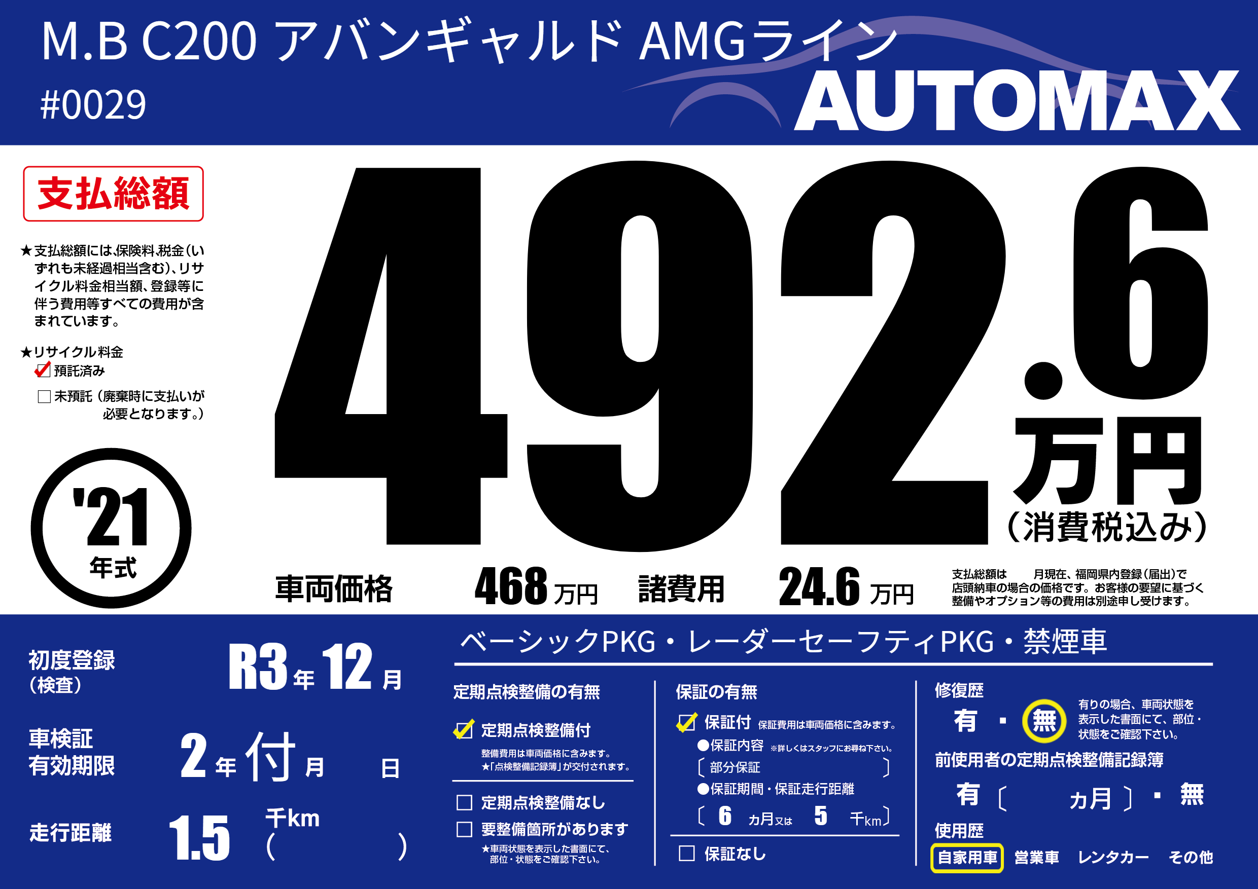 | 車名 | M.B C200 アバンギャルド AMGライン | グレード ミッション 排気量 |