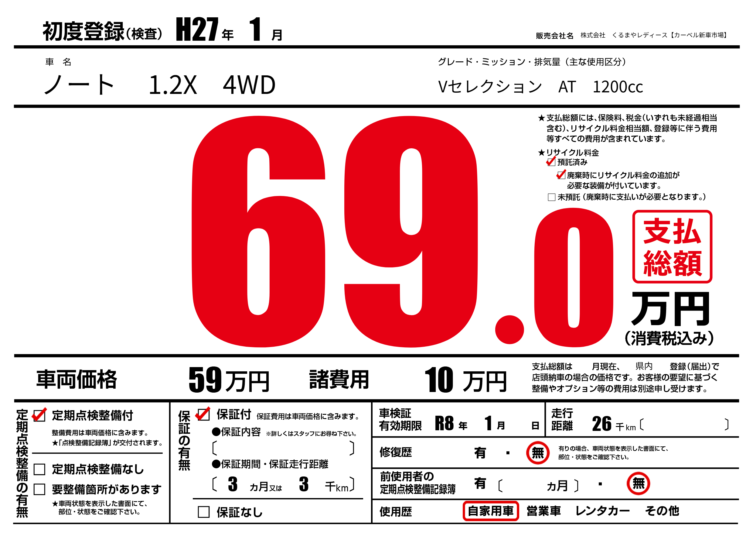 | 車名 | ノート 1.2X 4WD | グレード ミッション 排気量 |