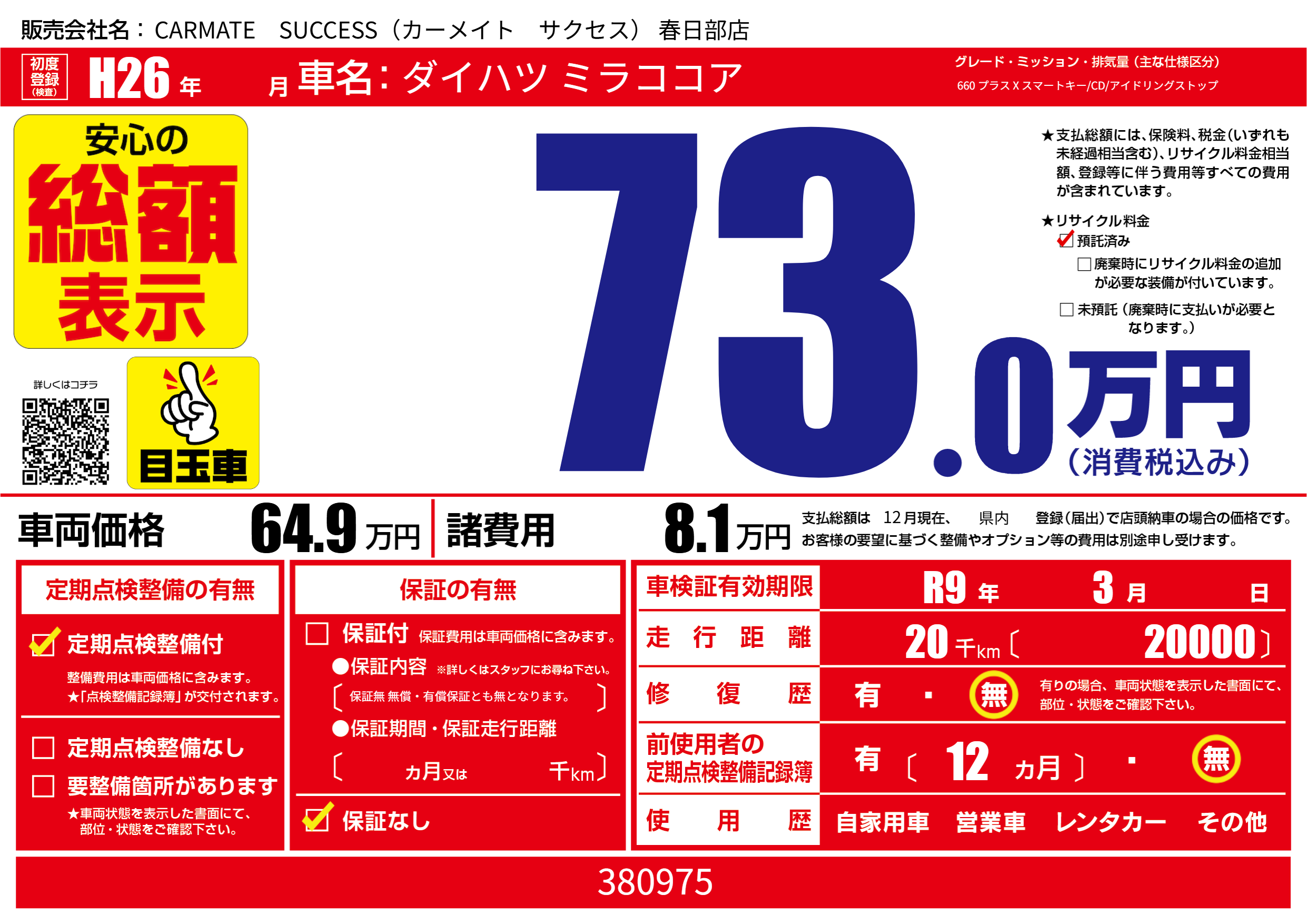 | 車名 | ダイハツ ミラココア | グレード ミッション 排気量 |