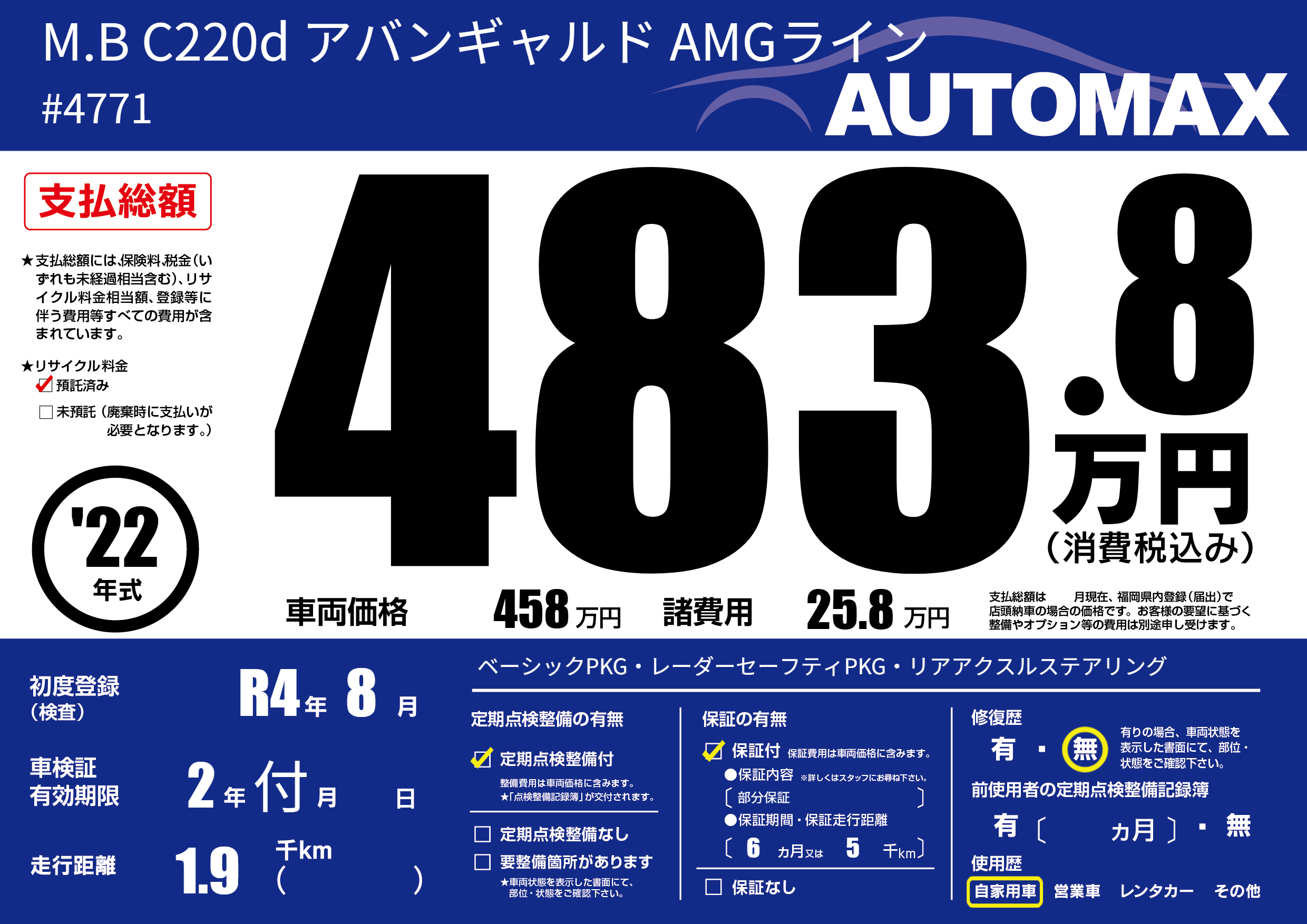 | 車名 | M.B C220d アバンギャルド AMGライン | グレード ミッション 排気量 |