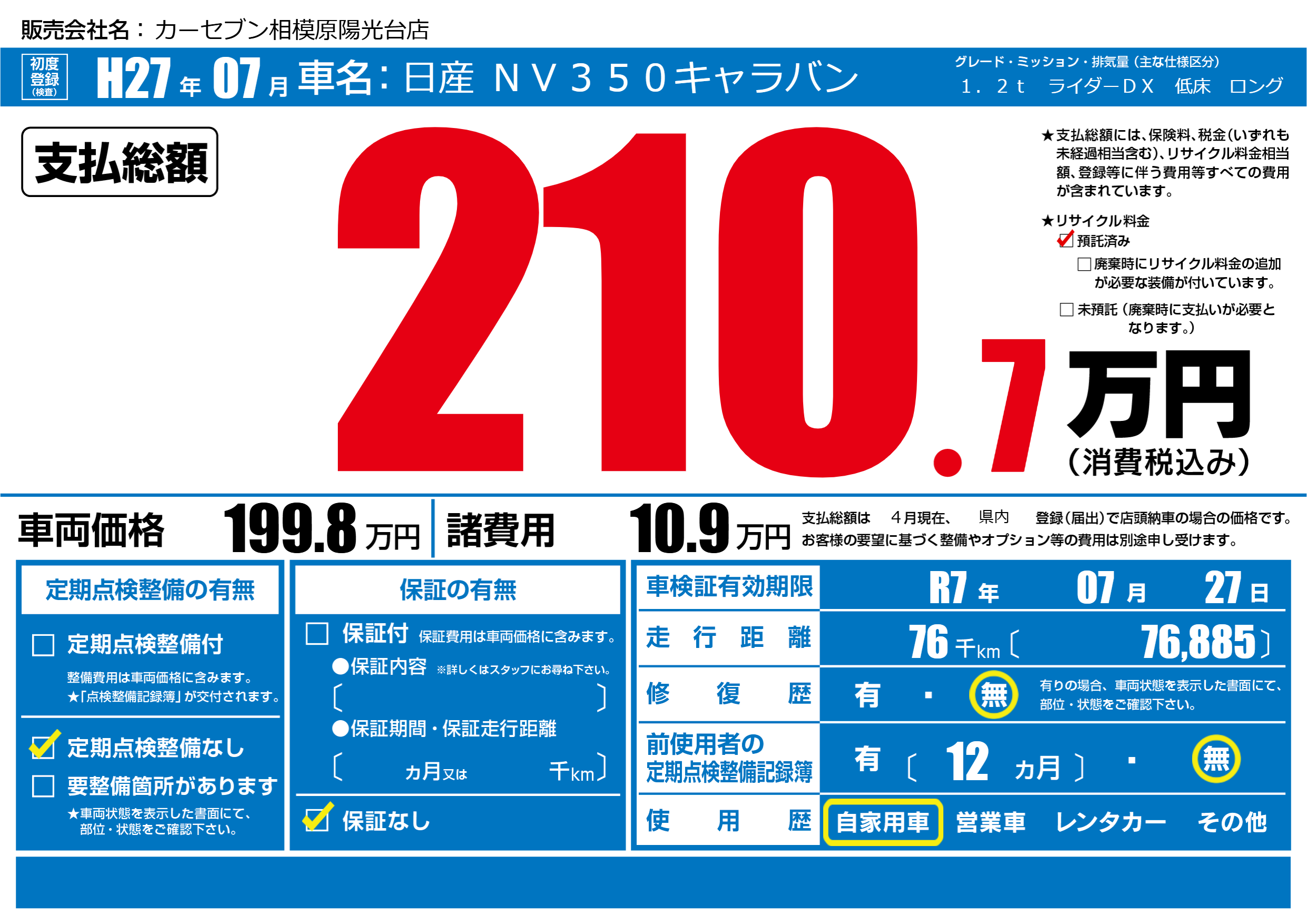 | 車名 | 日産 NV350キャラバン | グレード ミッション 排気量 |