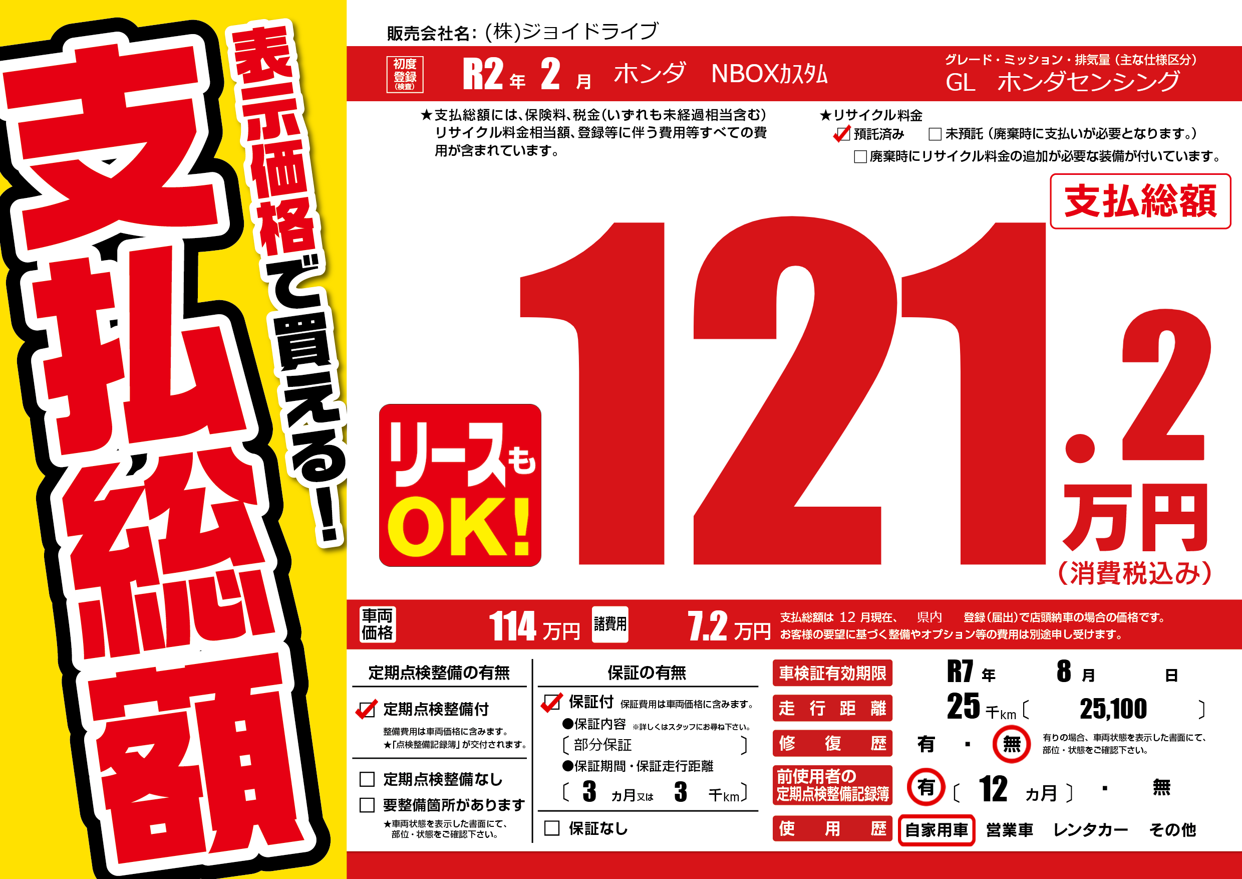 | 車検制限 | R7年 8月 - 日 | ||