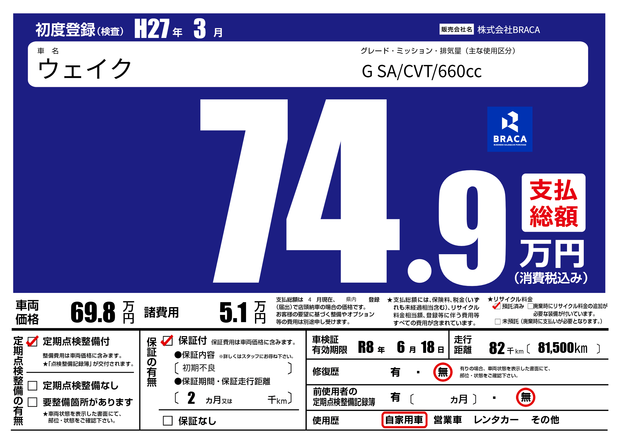 | 走行キロ | 8.2万km | 初年度登録 | H27年3月 |