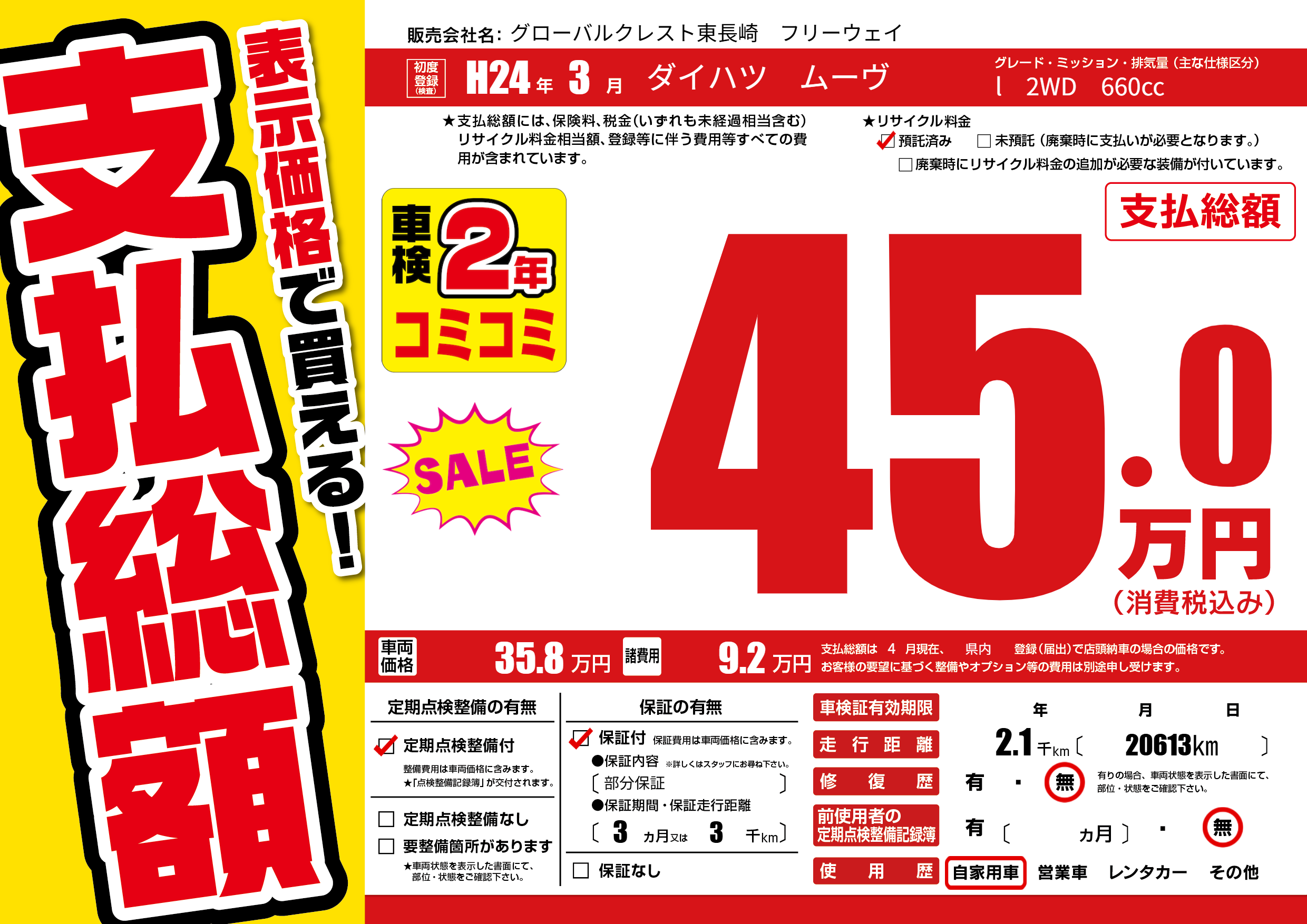 | 走行キロ | 0.2万km | 初年度登録 | H24年3月 |