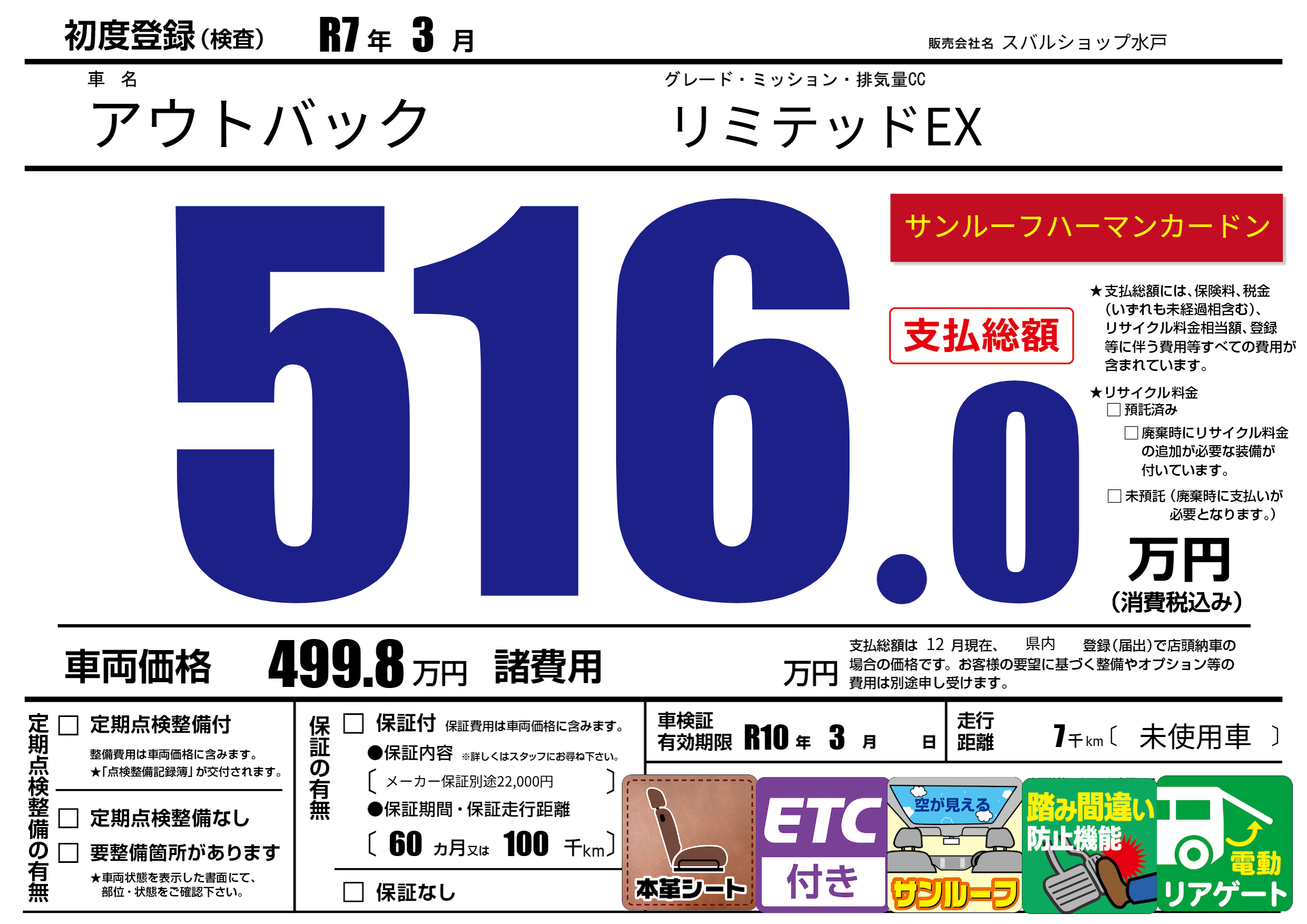 | 車名 | アウトバック | グレード ミッション 排気量 |
