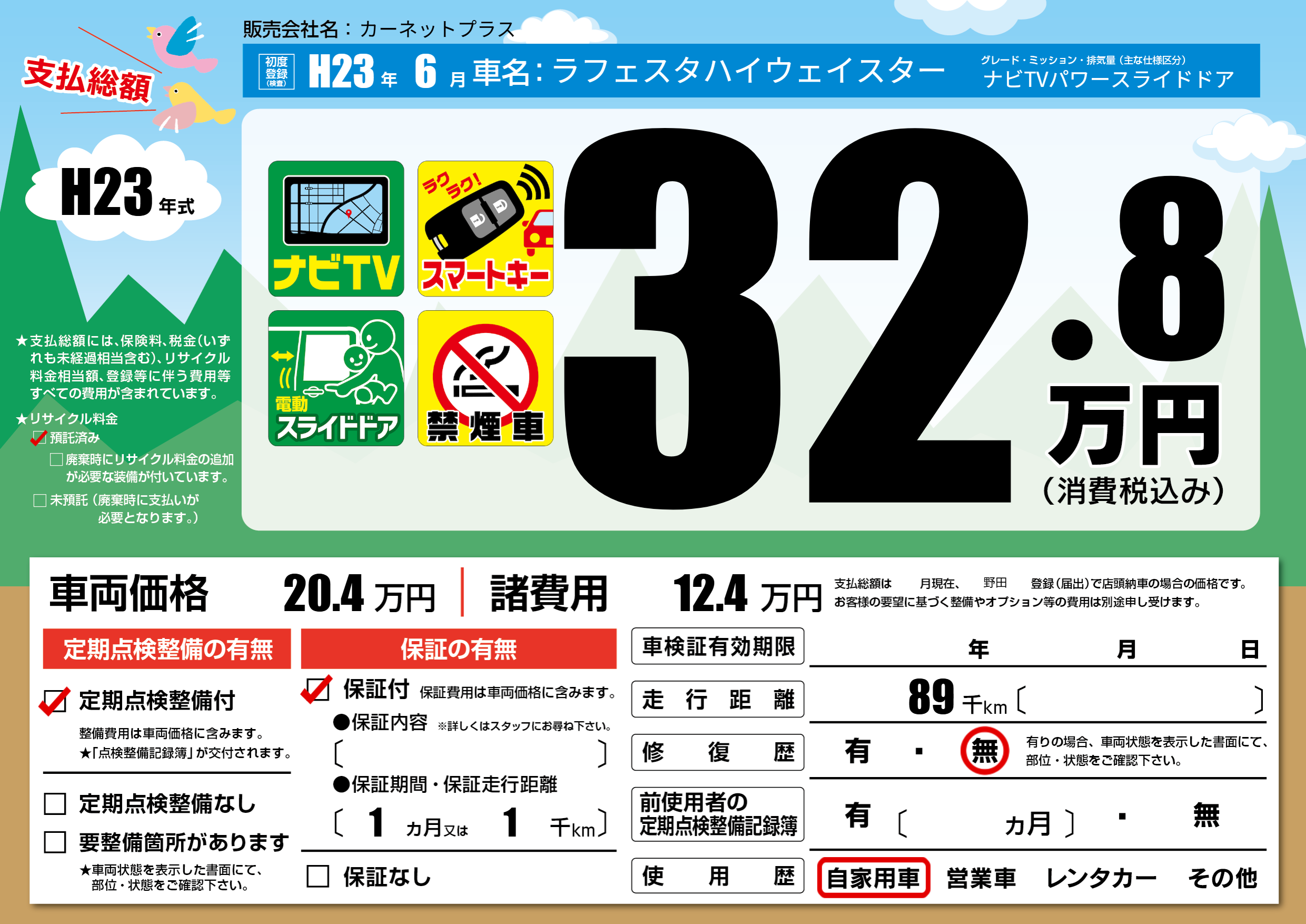 | 走行キロ | 8.9万km | 初年度登録 | H23年6月 |