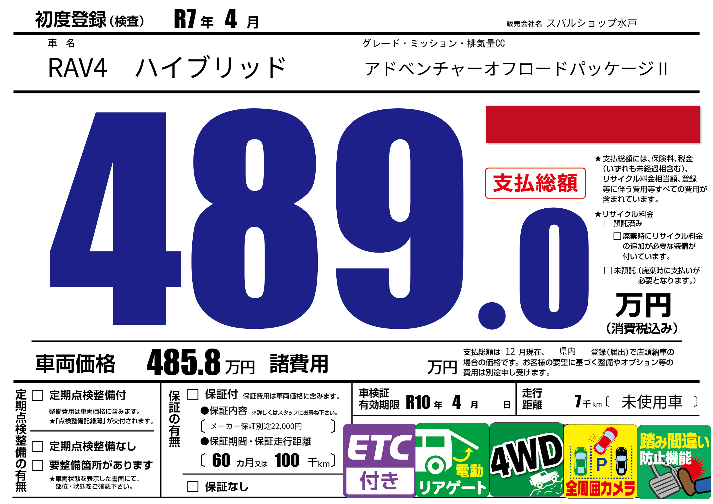 | 走行キロ | 0.7万km | 初年度登録 | R7年4月 |