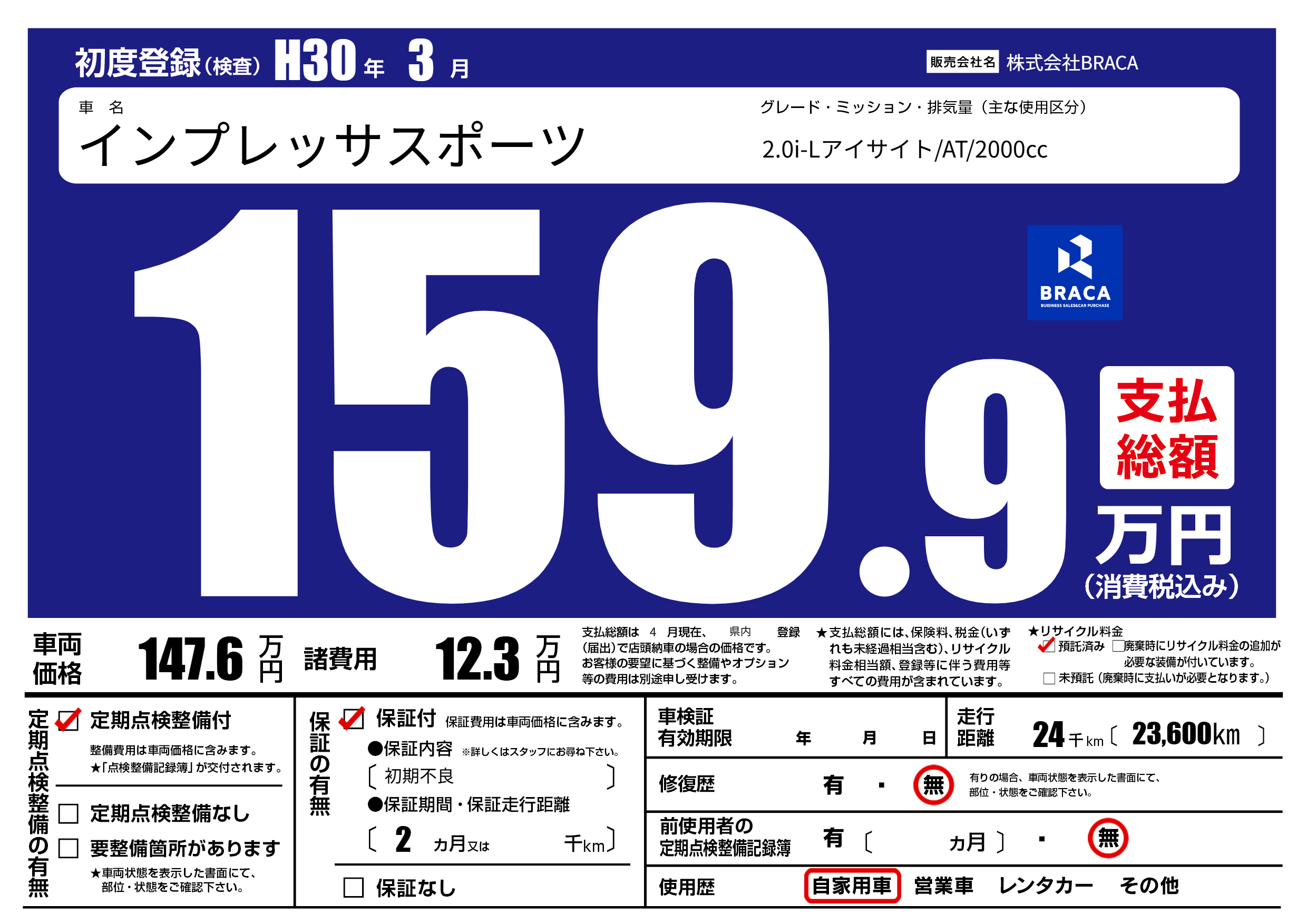 | 車名 | インプレッサスポーツ | グレード ミッション 排気量 |