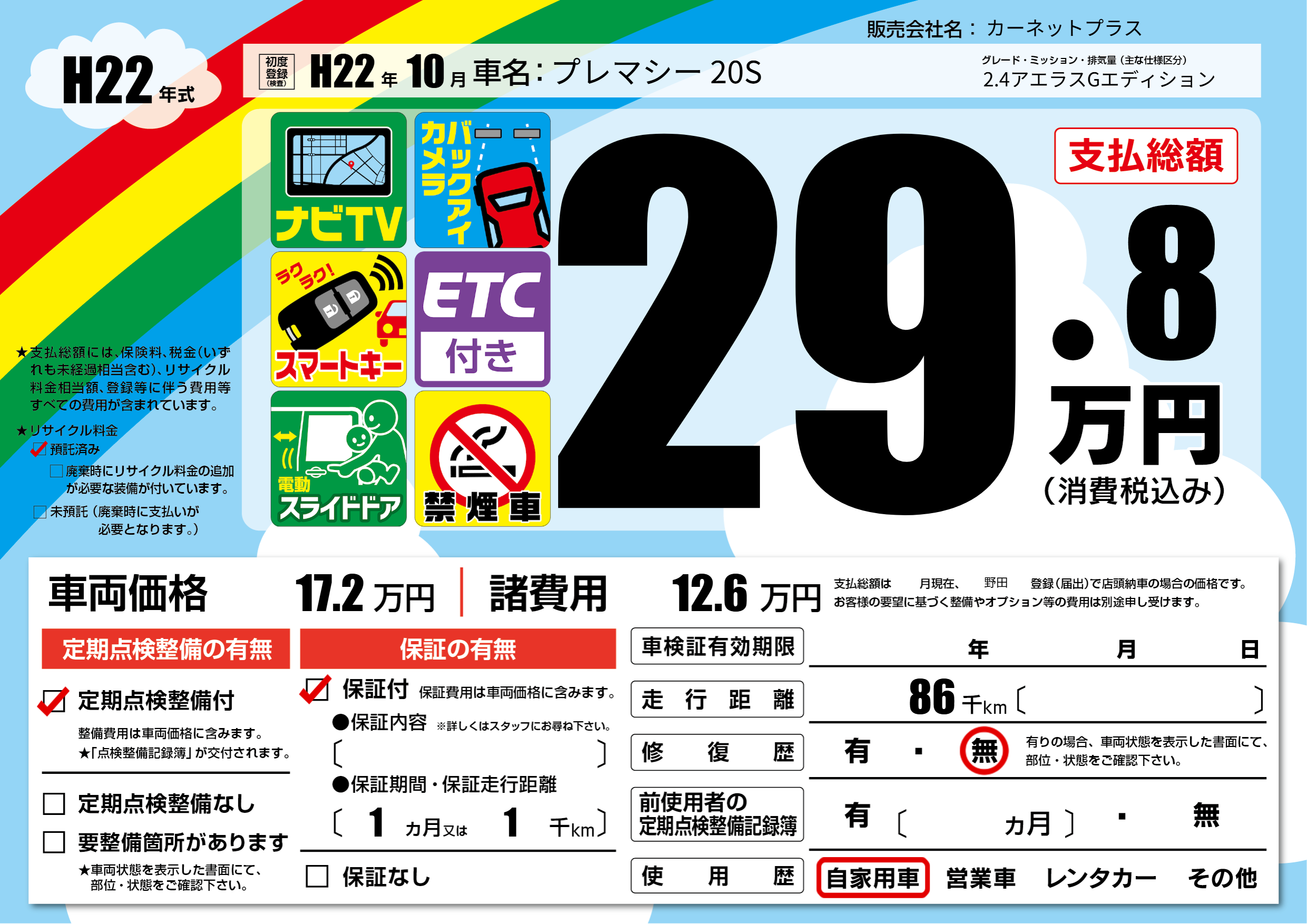 | 車名 | プレマシー 20S | グレード ミッション 排気量 |