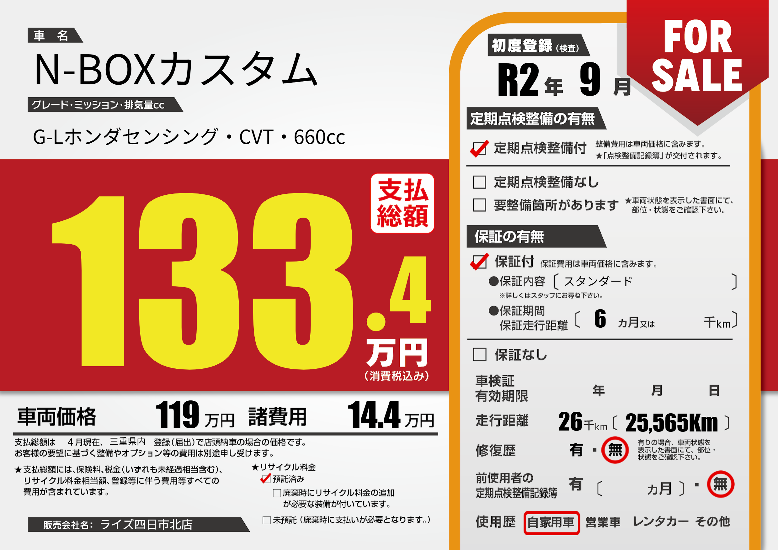 | 車名 | N-BOXカスタム | グレード ミッション 排気量 |