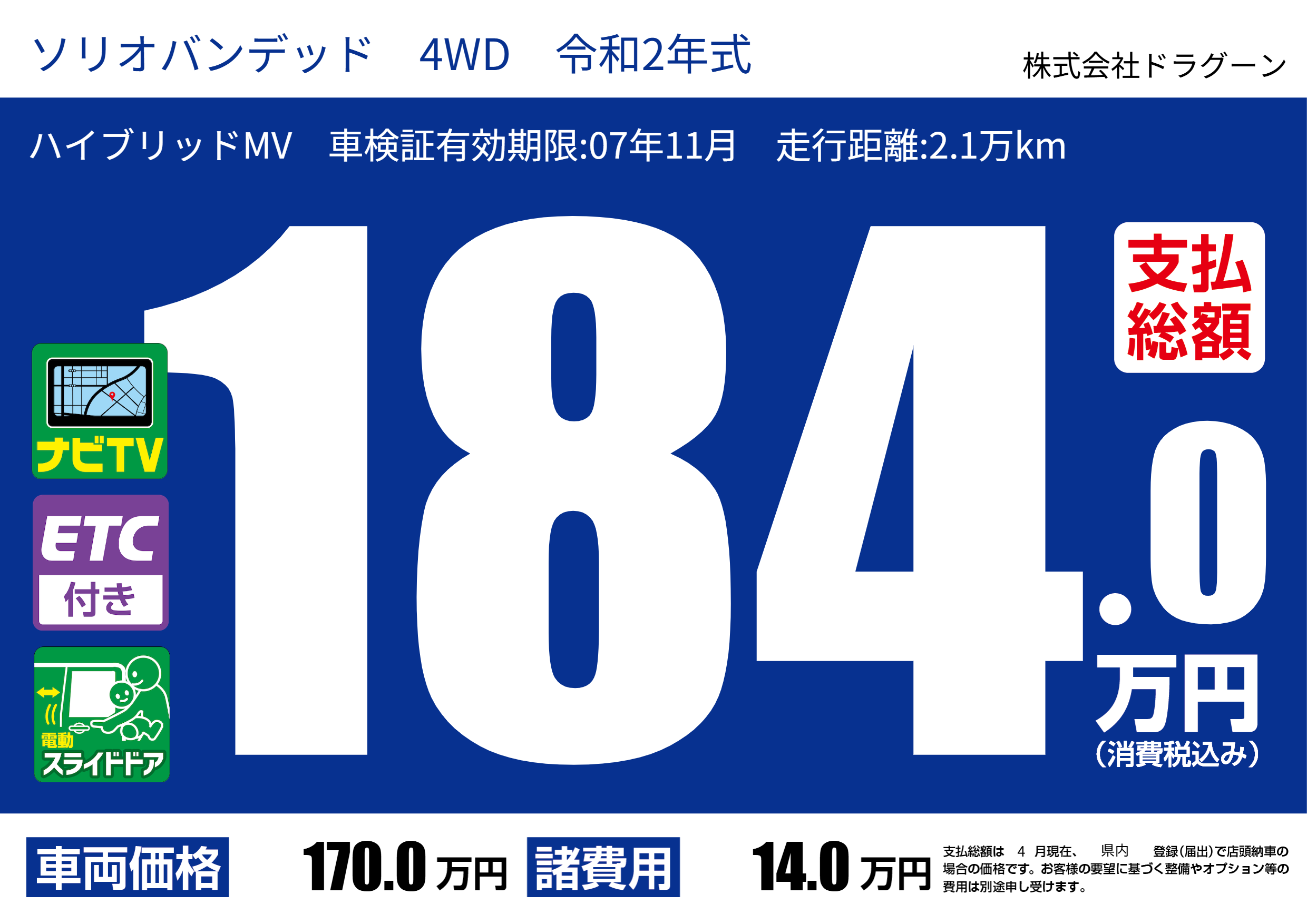 | 車名 | ソリオバンデッド 4WD 令和2年式 | グレード ミッション 排気量 |