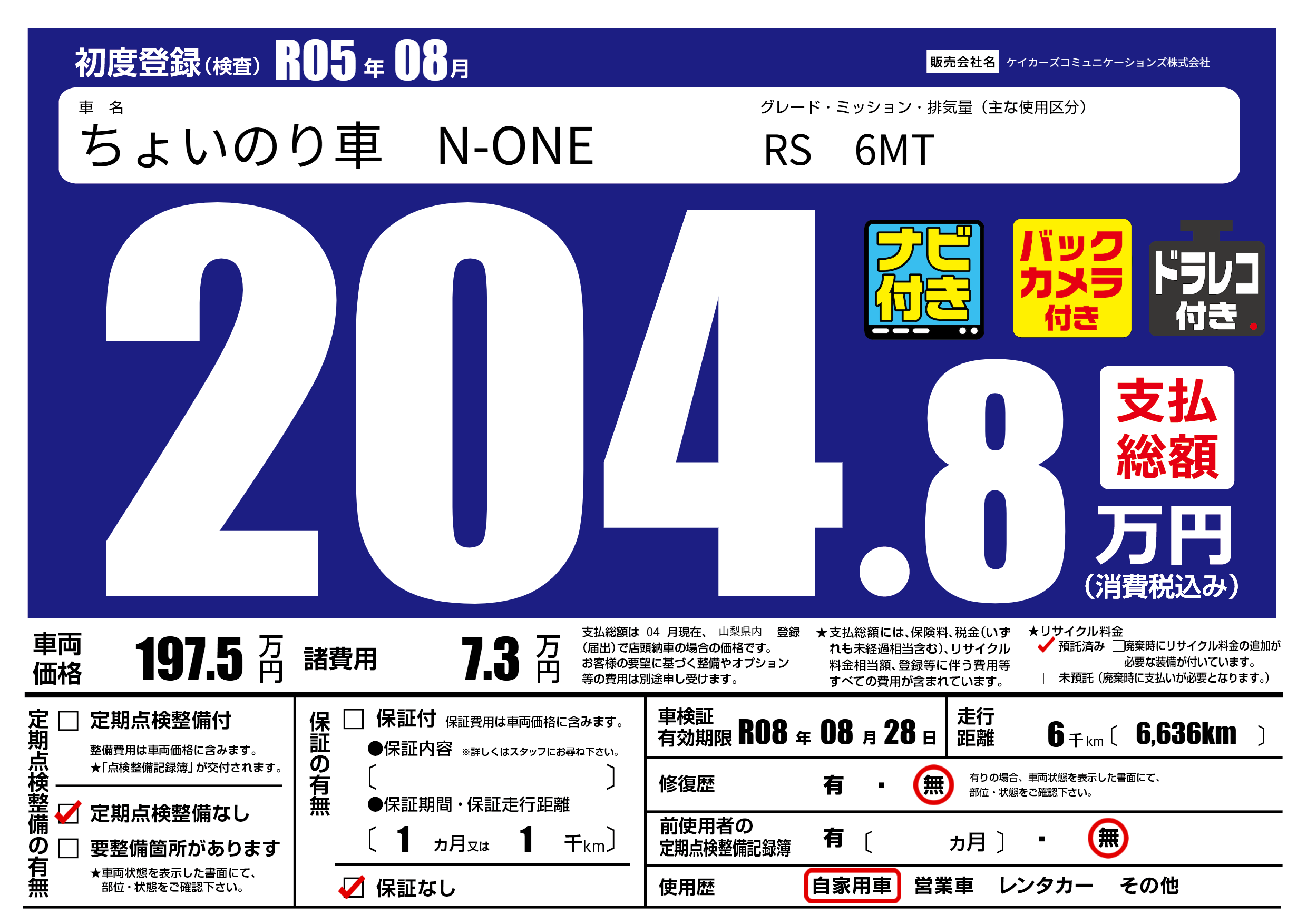 | 走行キロ | 0.6万km | 初年度登録 | R05年08月 |