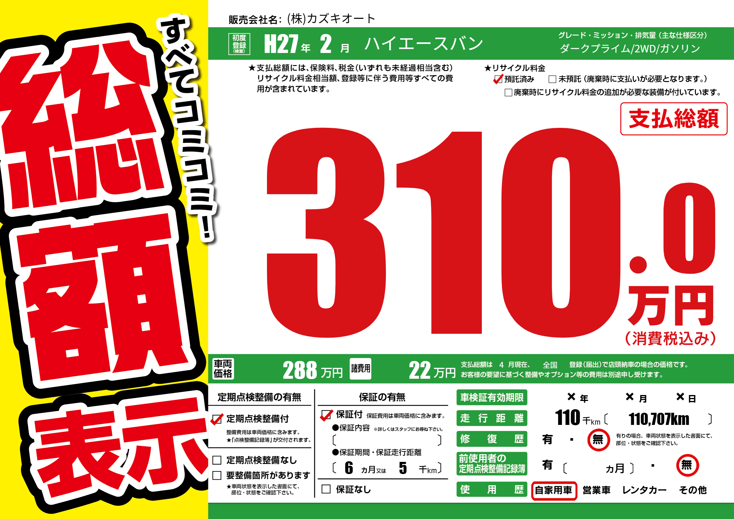 | 走行キロ | 11万km | 初年度登録 | H27年2月 |