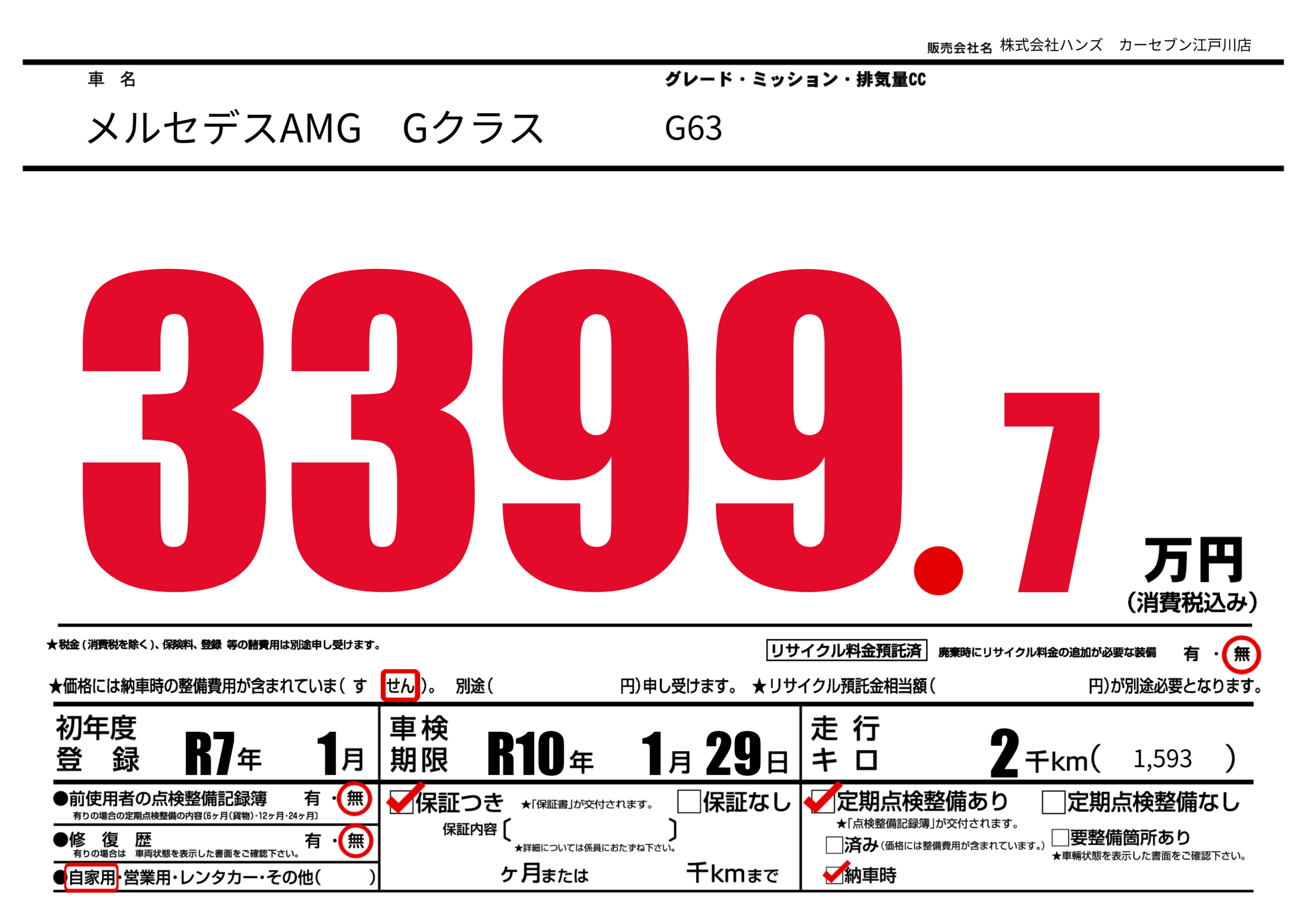 | 車名 | メルセデスAMG Gクラス | グレード ミッション 排気量 |