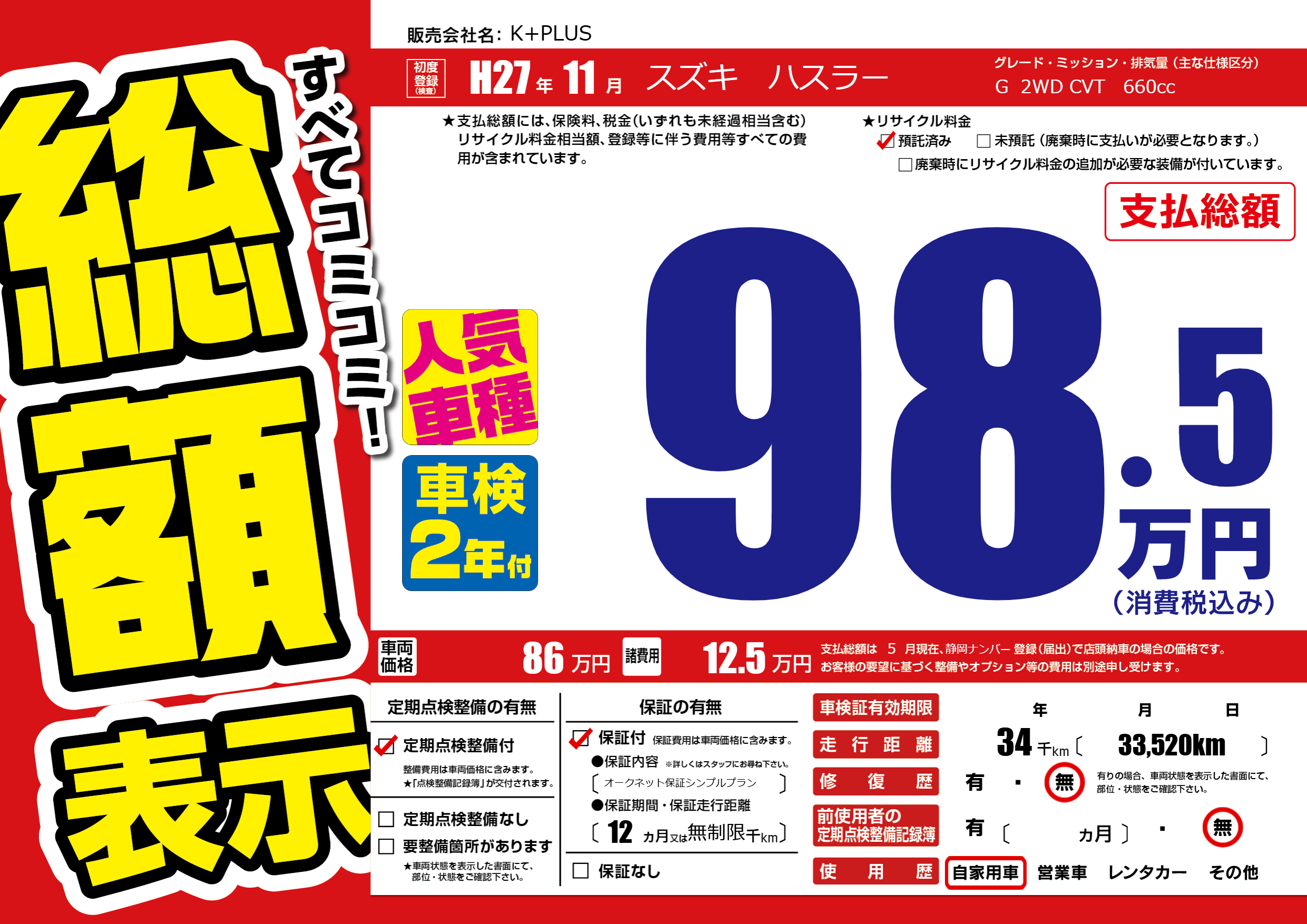 | 車名 | スズキ ハスラー | グレード ミッション 排気量 |
