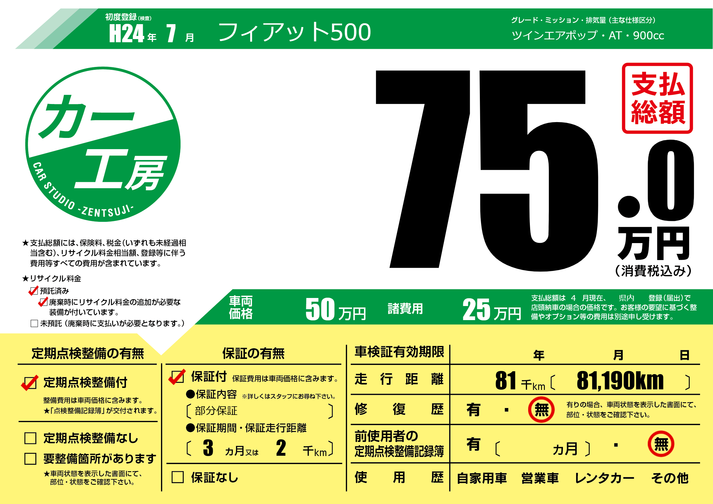| 車名 | フィアット500 | グレード ミッション 排気量 |